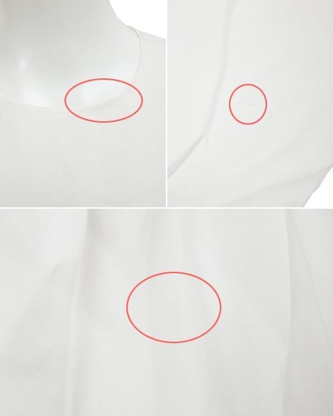 | コンディション | フロントネックに薄汚れ、右袖内側に線汚れ、と右袖先に薄い青線汚れ、右サイドフリルに薄点汚れがありますが、着用感は少ないです。 |