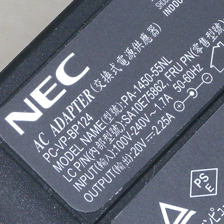 送料無料 NEC 純正 ACアダプター PC-VP-BP124 PA-1450-55NL センタープラス 20V 20.0V 2.25A 45W DCプラグ 外径 4mm 4ミリ 即決!