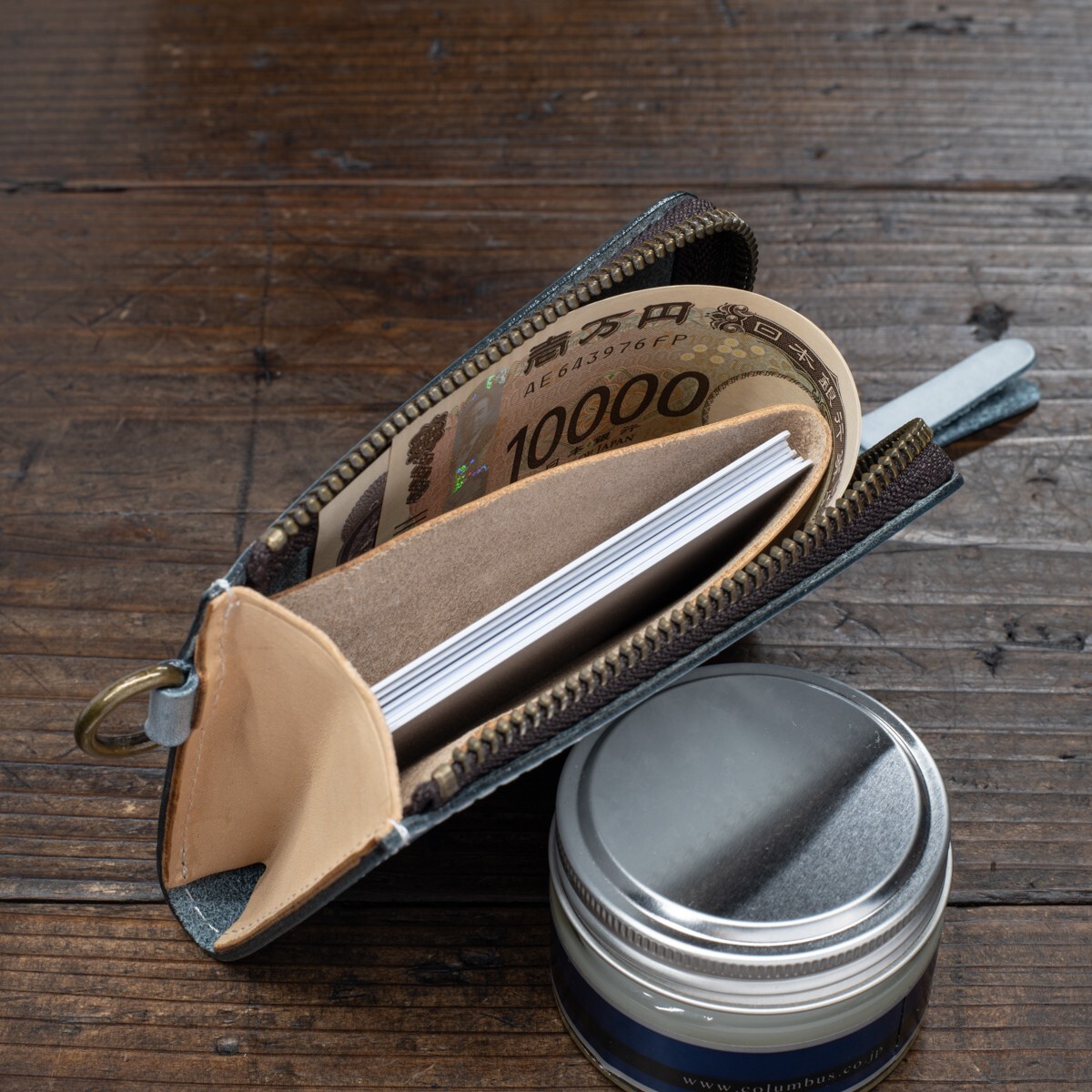 L字ファスナーで大きく開き、中央の間仕切りポケットに小銭やカードを収納可能。プラスチックカードなら10枚ほど、紙のカードや名刺ならさらに収まります。Dカン付きでウォレットチェーンも装着できます。