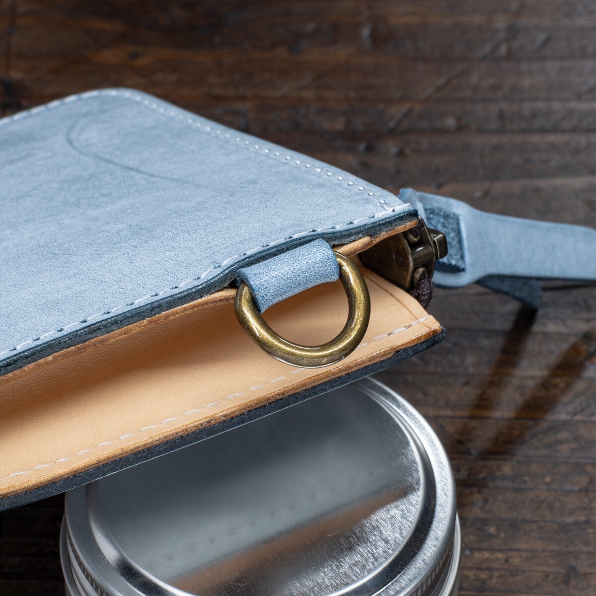 ホワイトワックスを染み込ませたワックスレザーを使用し、独特の色合いと撥水性を備えています。使いはじめは硬めですが、使うほどに柔らかく馴染み、色や艶に深みが増していきます。内側も本革仕立てで、摩耗に弱い布地は使っていません。