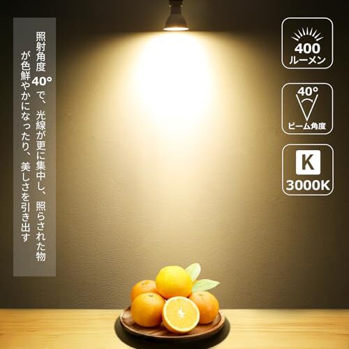 【集光タイプ・即点灯】落ち着きのある電球色、照射角度は40°で光線が更に集中、照らされた物が色鮮やかになったり、美しさを引き出します。商業照明の看板照明、ジュエリーの展示照明などに活躍しています。家庭照明にもよく使われ、特にダクトレールライトとダウンライトに最適です。スイッチを入れた瞬間に明るく点灯します。それに、紫外線と赤外線はほとんど出ないので、虫が寄りにくい。