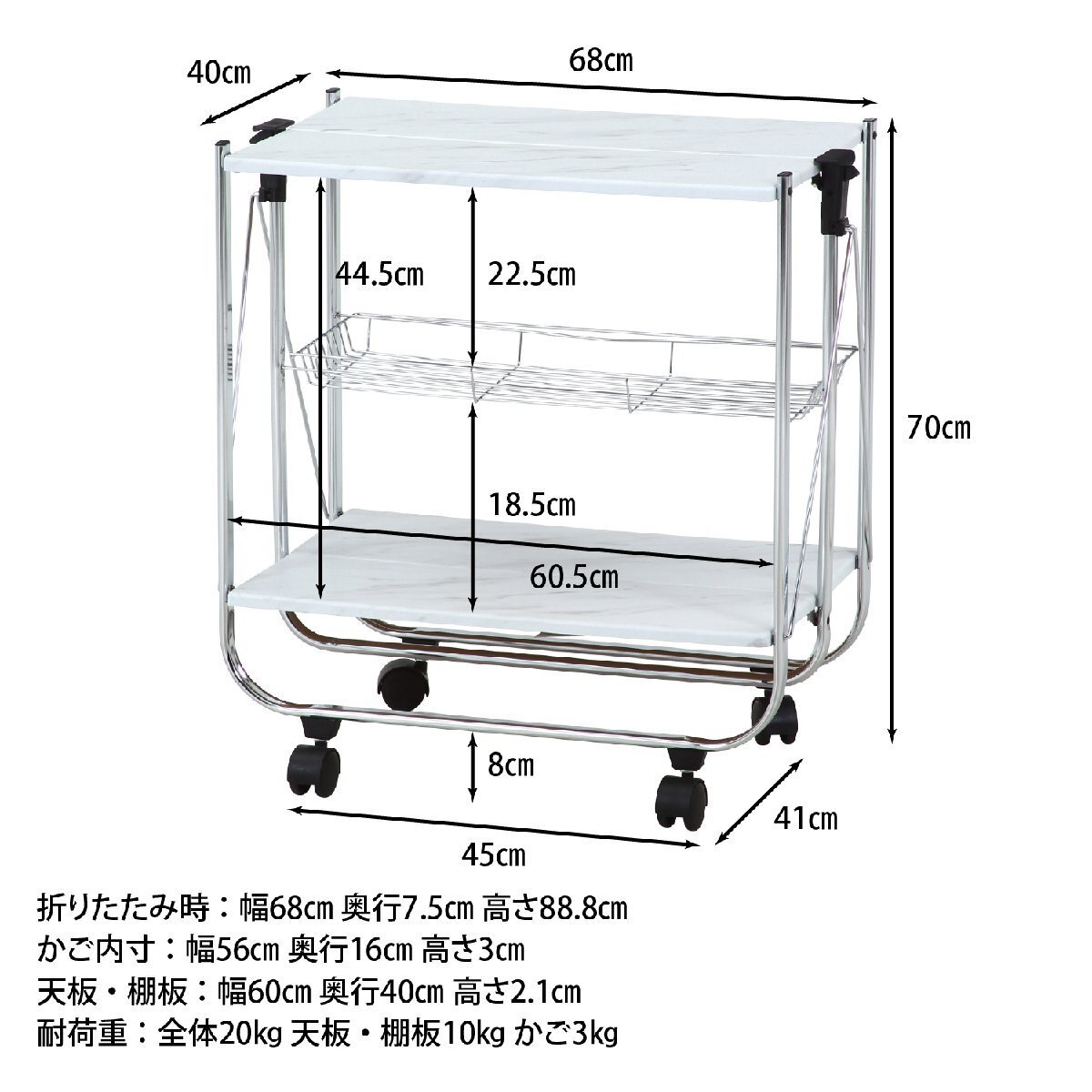 | サイズ | 全体:幅680 × 奥行400 × 高さ700mm 耐荷重(天板/棚板):12kg 耐荷重(かご):3kg 耐荷重(全体):20kg 折りたたみサイズ:680x69x890mm ※サイズ詳細はサイズ画像をご参照ください。 |
