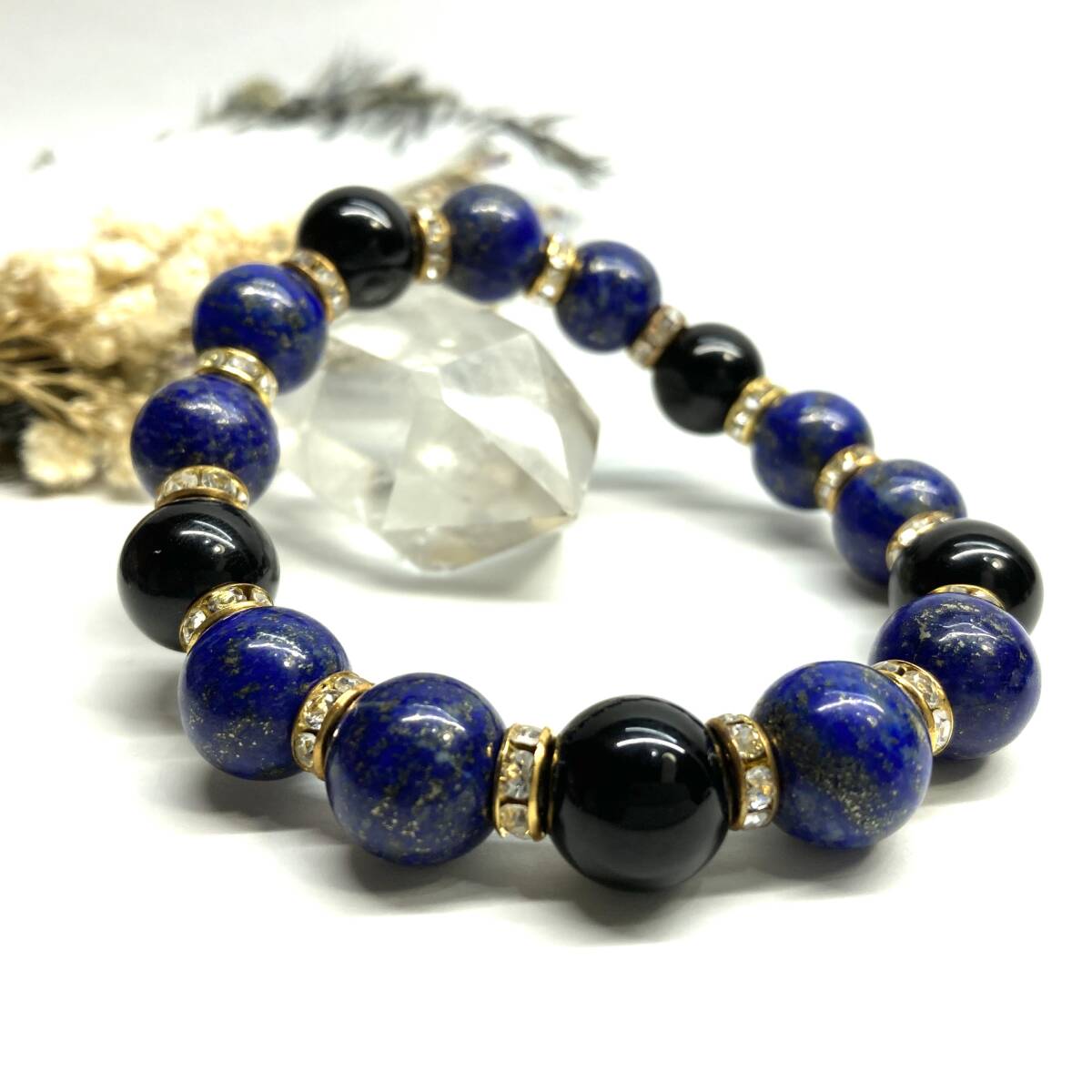 こちらは、ラピスラズリとモリオンを組み合わせたパワーストーンブレスレットです。間にはロンデルを挟み高級感あるデザインに仕上げております。程よくインパクトがある12mm玉を使用して内周約18cmです。(サイズ変更の場合は取引ナビにてご連絡をお願いします。) 数に限りがございますので気になる方はお早めにどうぞ。