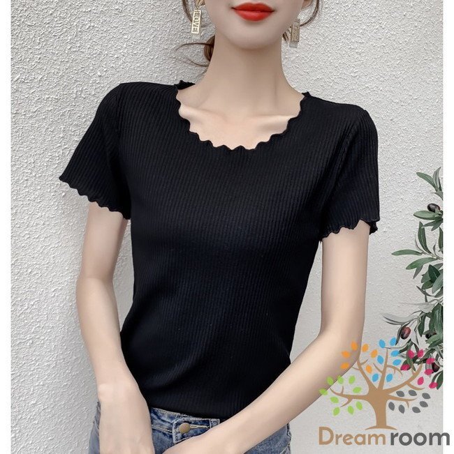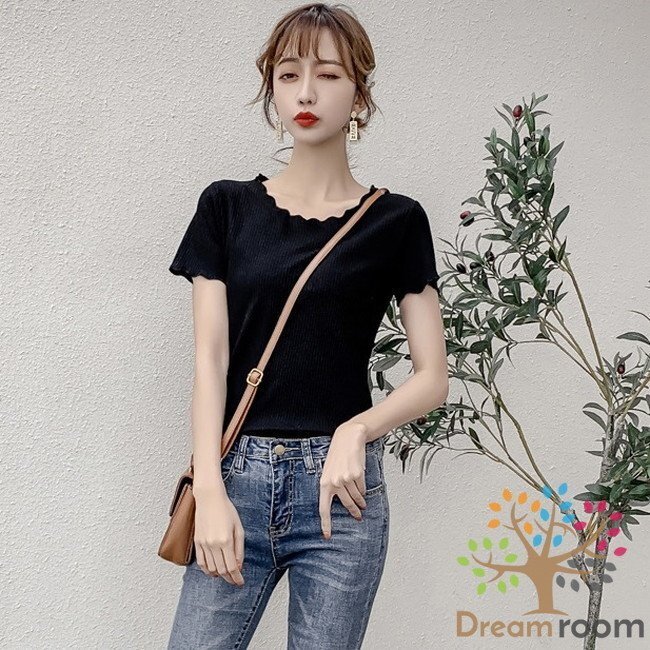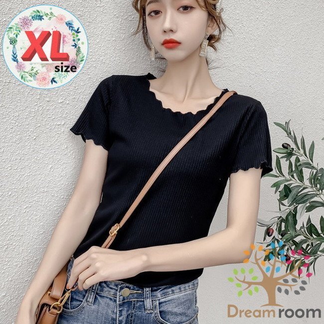 1スタ☆Solid color ラウンドフリル Tシャツ XLサイズ 美ライン 半袖 レディース オフィス カジュアル 無地 綺麗め K-088-1ブラック