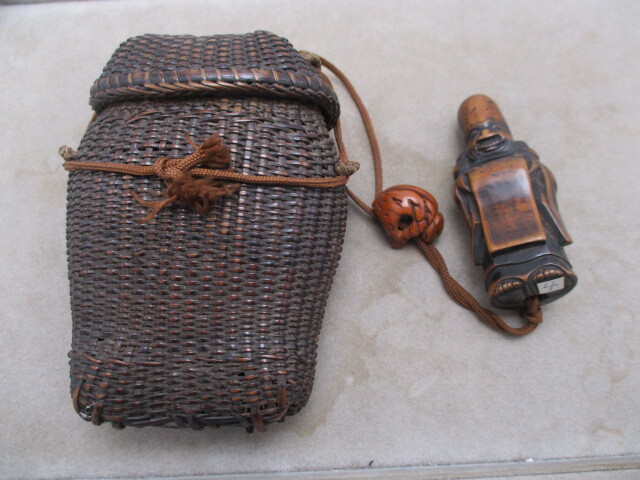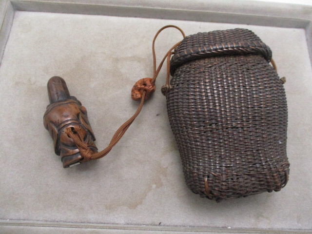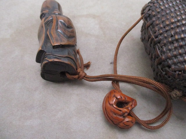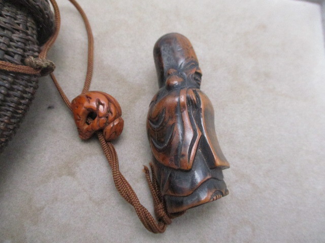| ★☆骨董品 レトロ アンティーク 根付 煙草入れ 網かご 寿老人 彫刻 提げ物☆★ | ||