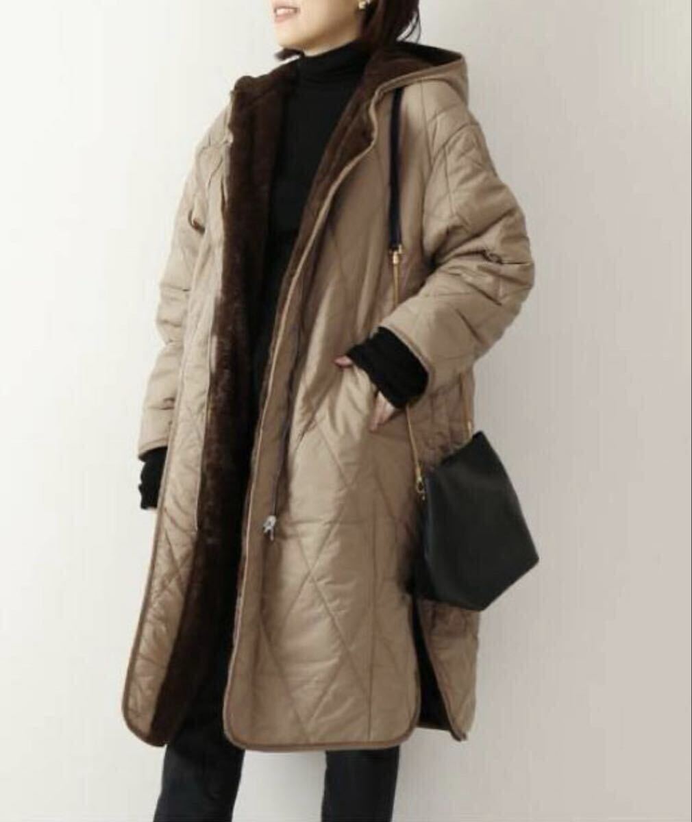キルティングコートです。リバーシブルになっています。光沢感のあるナイロン生地は高級感があり、中ボア付のカジュアル感のある2つの特長が魅力のコート。