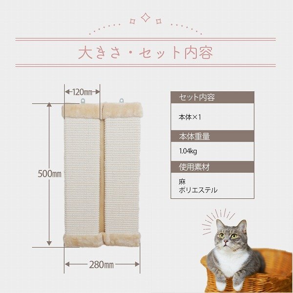 新築、借家の壁や柱を猫の爪とぎ被害から守ってくれます。 本体の真ん中が開いているので、柱だけではなく二つ折りしても使うことができます。 使い方次第で様々な置き方が可能です♪ ■商品仕様 サイズ(約):250×510×25mm 重量(約):1.04g 材質:麻、ポリエステル ■注意事項 ・こちらの商品はお客様組み立てとなります。 ・製品は接着剤や麻の臭いがすることがあります。臭いが気になりましたら、風通しの良いところで陰干ししてください。 ・海外製品で、簡易梱包での輸入のため風防に擦れや多少の小キズなどがある場合がございますが、商品自体には問題ありませんのでご了承下さい。 ・仕様・デザインは改良のため予告なく変更することがあります。 |