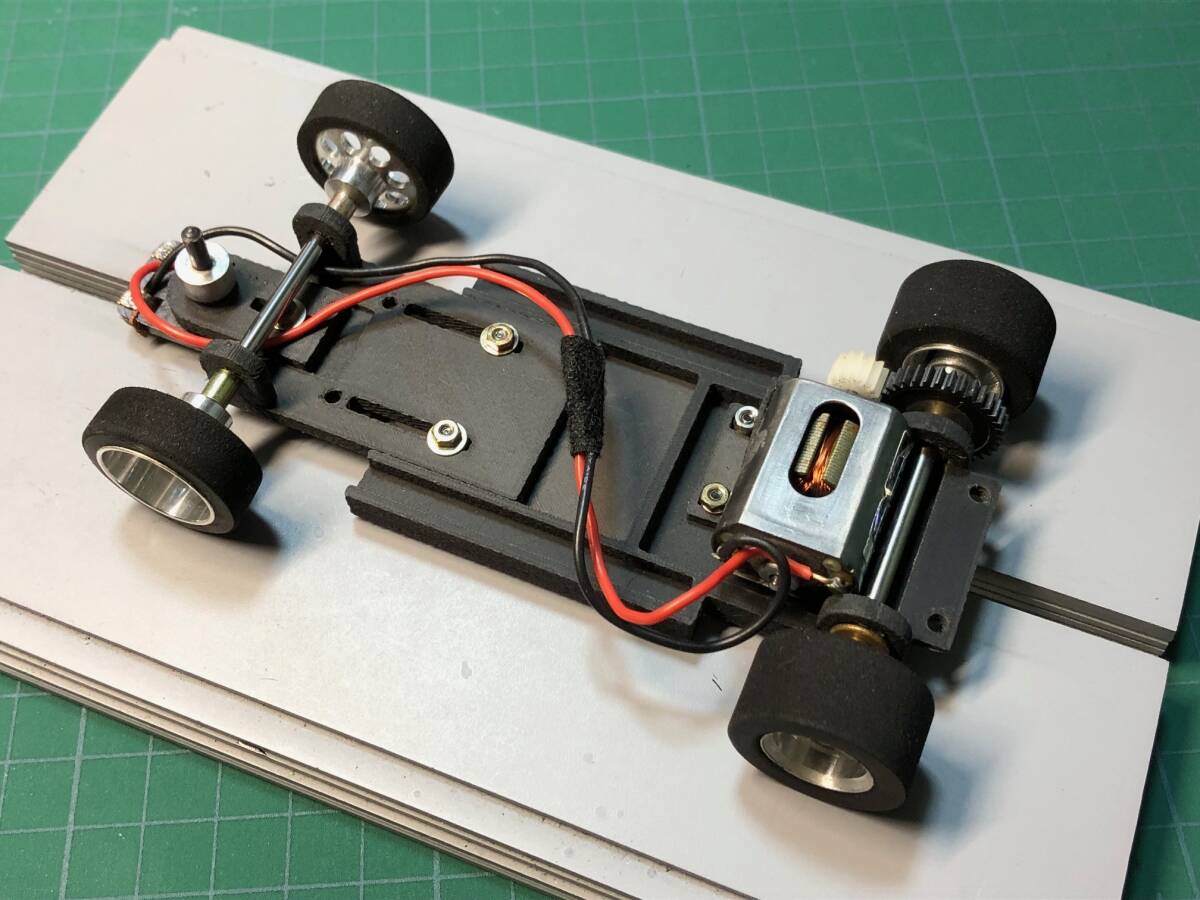 お座敷サーキットでは充分遊べる1/24スロットカーシャシーです。