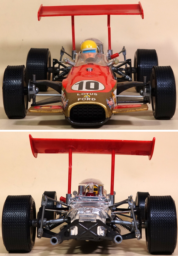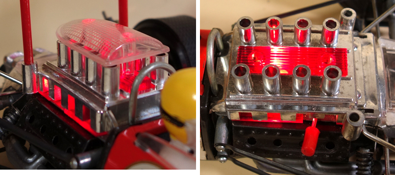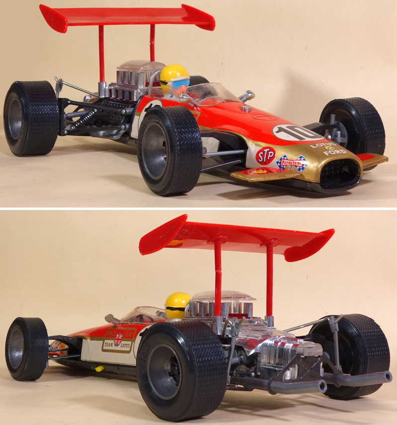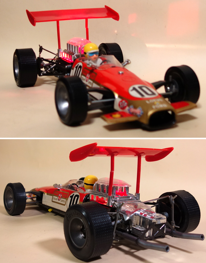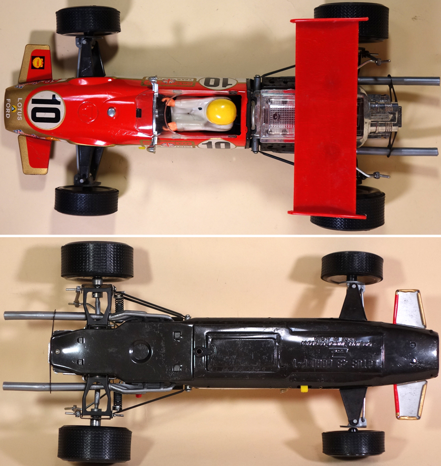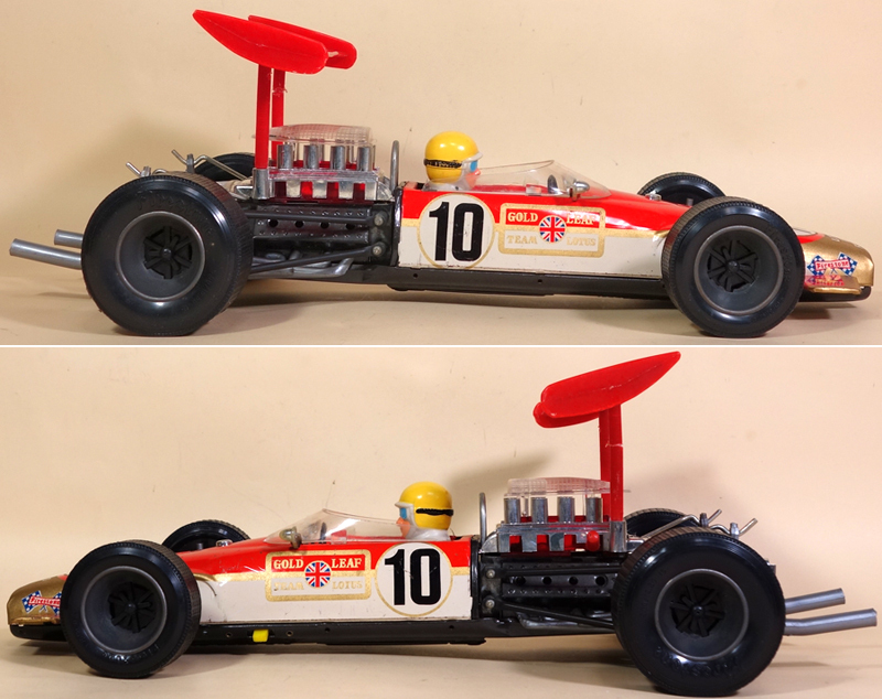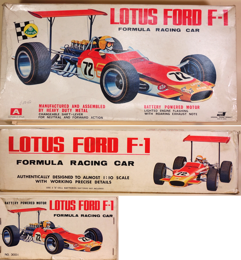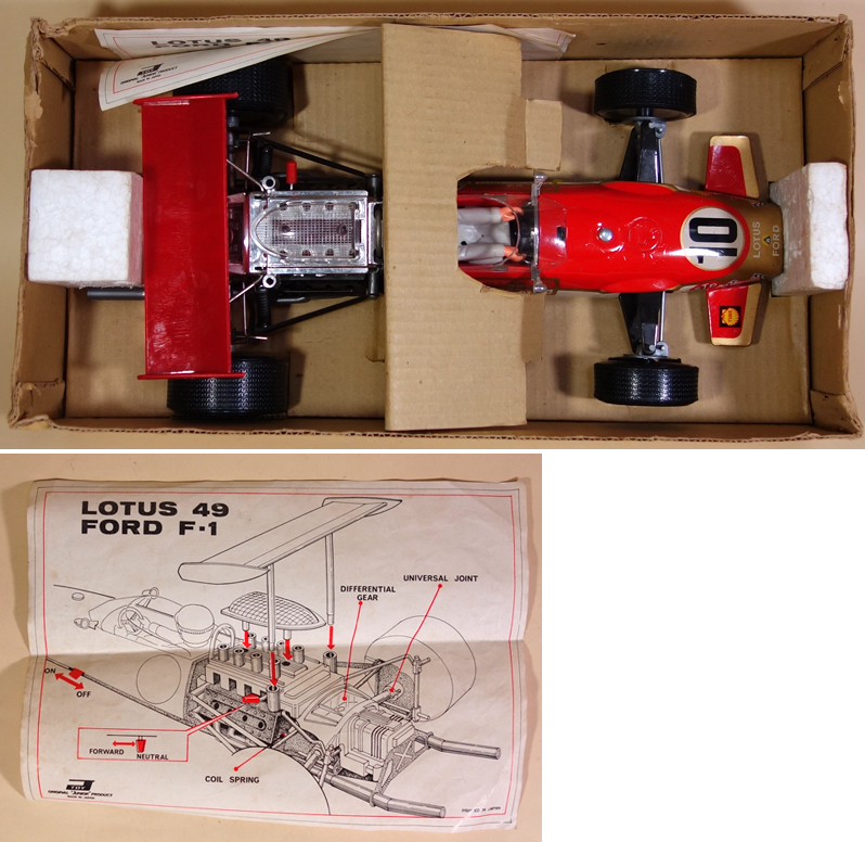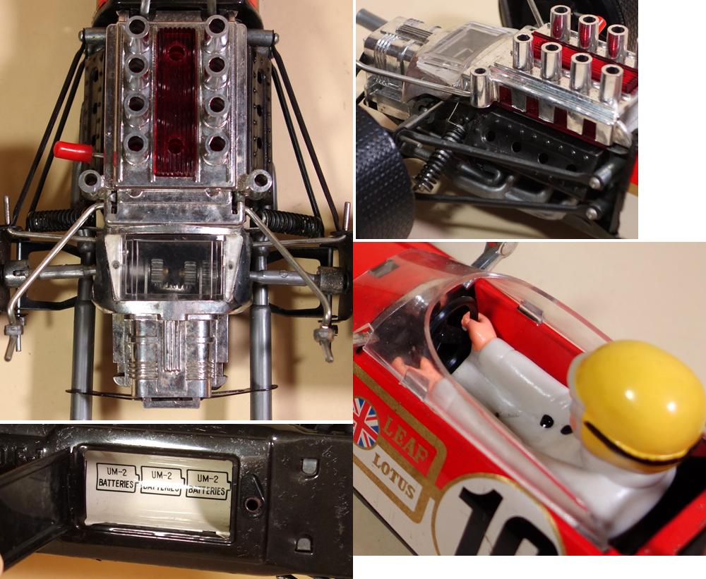 出品は画像の物のみです。電池は付属しません。メカニカルな部分やボディなどはかなり本格的な物でとても子供用とは思えません。取り説が英語なので輸出用かと思われます。かなり古い物です。箱は端の方に数字が手書きで書いてあったり、擦り傷、汚れやへこみが所々に有ります。車も汚れや擦り傷があります。若干錆が有る箇所もあるかと思います。画像をご覧のようにリアウィングのポールが片方折れています。画像は穴に刺して支えるような形で画像を撮っております。飾るだけならこれでもいいかなと思います。あとフロントのホイールを支えている板が曲がっています。前から水平に見たらわかります。そのほかウィンドー部分に若干割れが有る箇所もあります。電池を入れるとエンジン部分のライトのみつきます。しかしスイッチが微妙にずれていますので少しずらして押せばちゃんと反応します。エンジンサイドについている赤い棒を前に動かせば前進と説明書に記載がありますが前進はしませんでした。分かる事は以上です。お取り引き後はいかなる理由がありましても返品はできませんしクレームもお受け出来ません。万が一他に問題が有ったとしてもご自分でご対処ください。