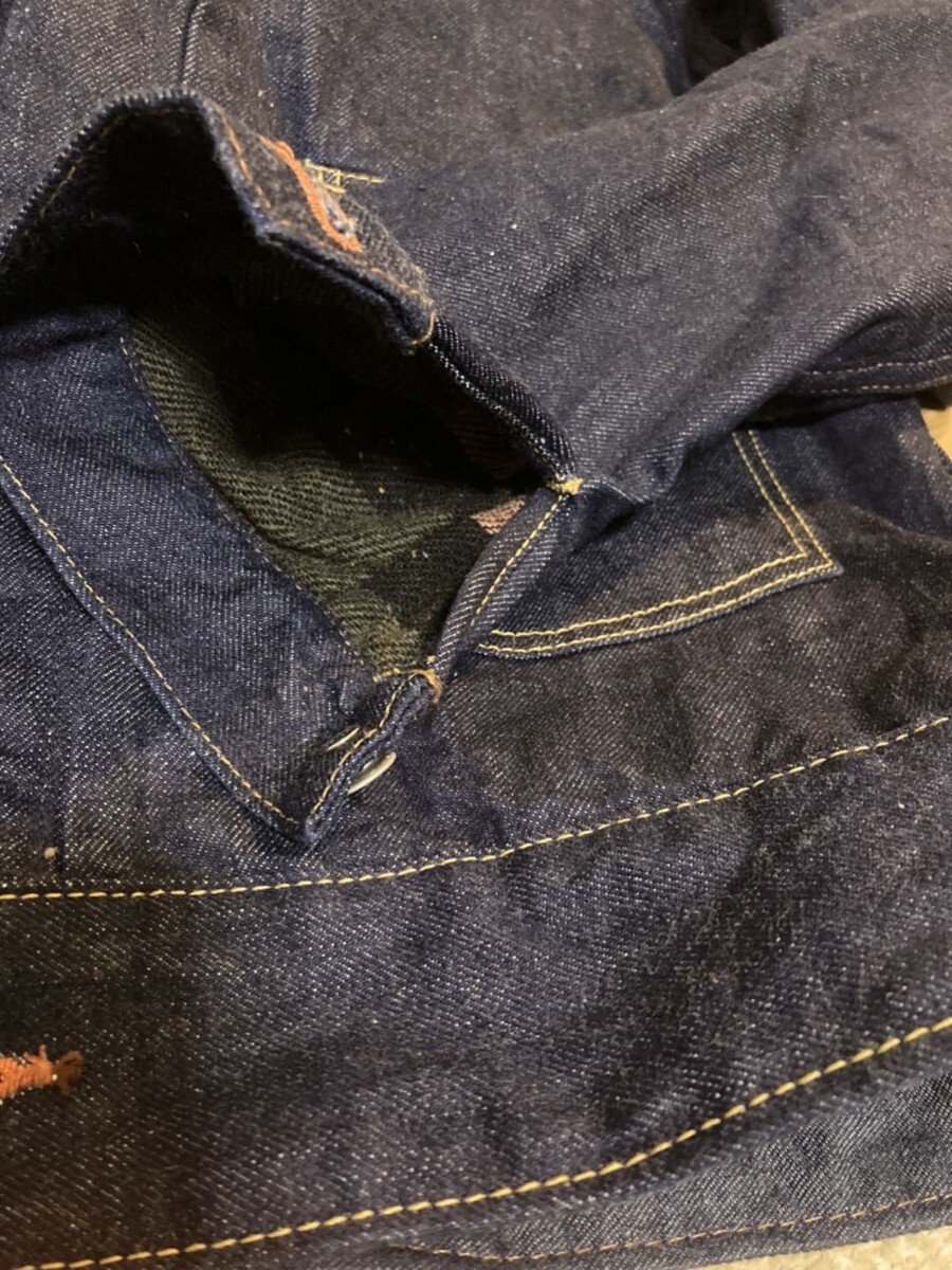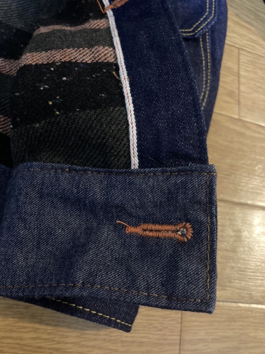 表地は12オンスくらい?のやや青味のあるセルビッチの生機、裏地のライニングはおまかせしましたが、リーバイスっぽい感じの横縞ライニングで、裏地は別縫いして表と合わす仕様です。