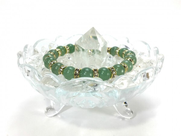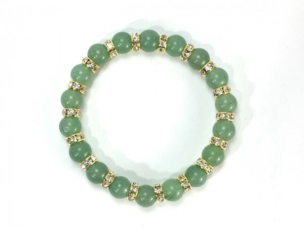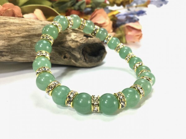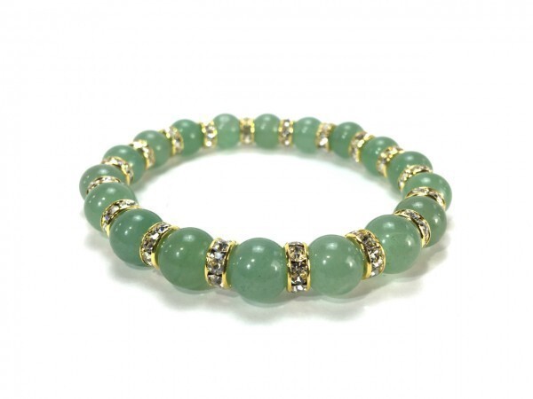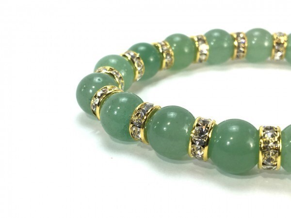 こちらは、10mm玉のアベンチュリンを使用したパワーストーンブレスレットです。間にはロンデルを挟み高級感あるブレスレットに仕上げています。石大きさは腕にも馴染みやすいように10mm玉を使用して、サイズは内径約18cmです。(サイズ調節も無料で承っています。サイズ変更の場合は落札後、取引ナビにてご一報くださいませ。) 数に限りがございますので気になる方はお早めにどうぞ。