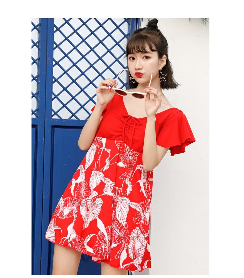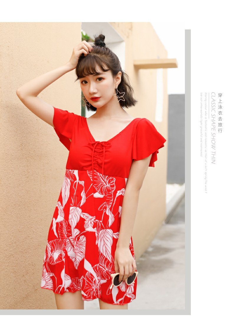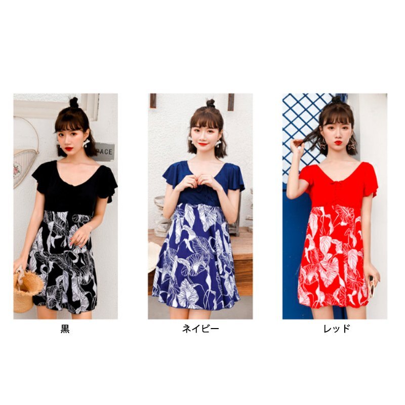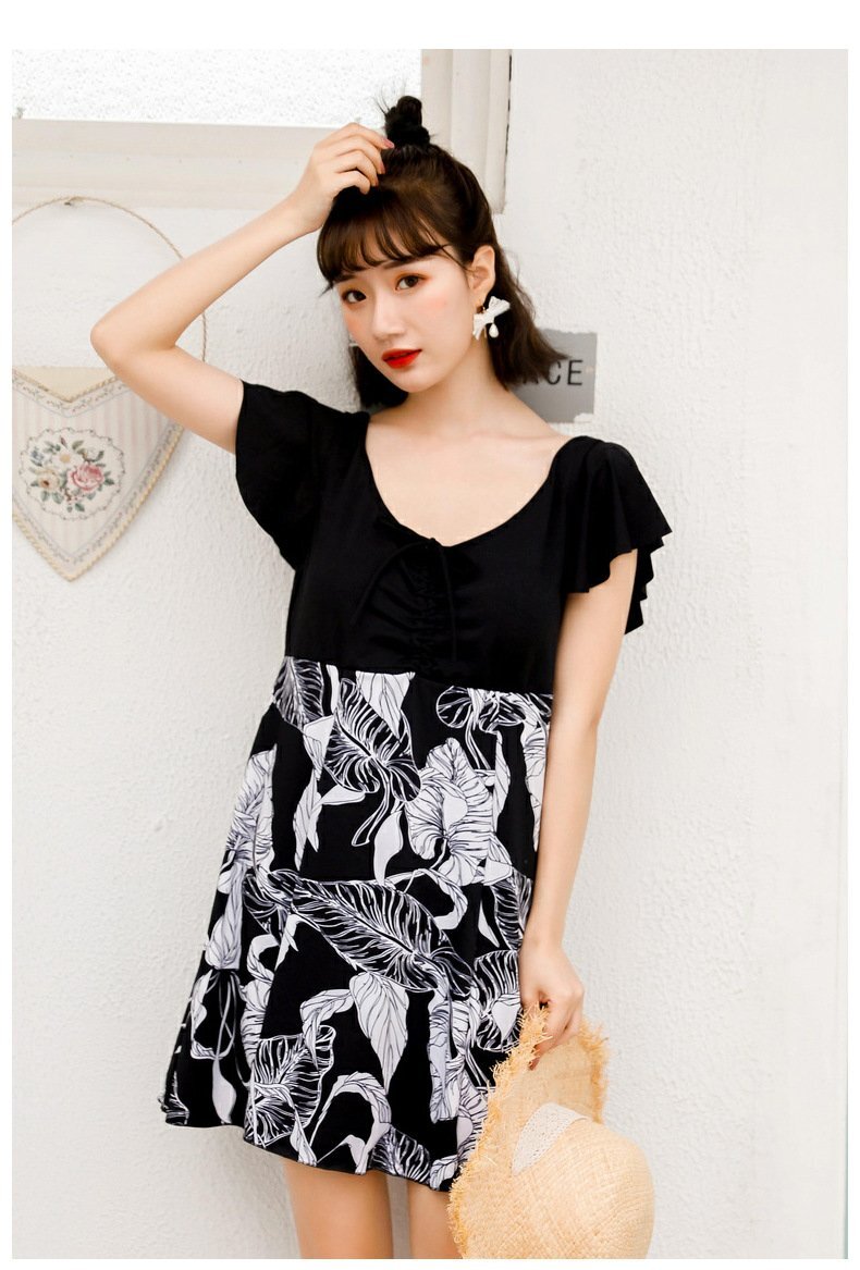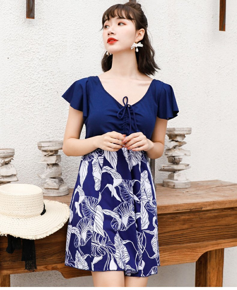 ・リーフ柄がお洒落なワンピース水着。フロントはシンプルなAラインシルエットです。
