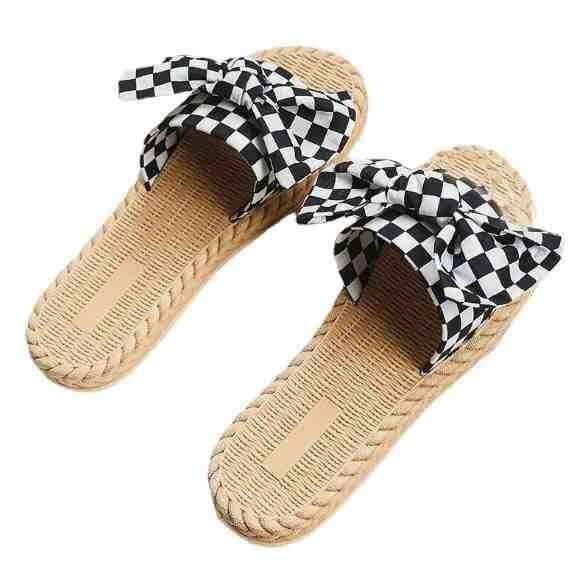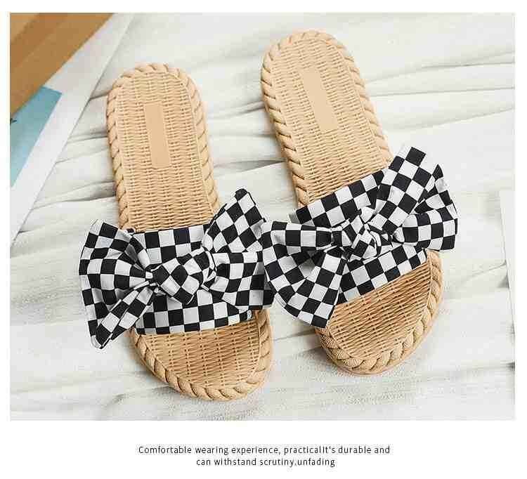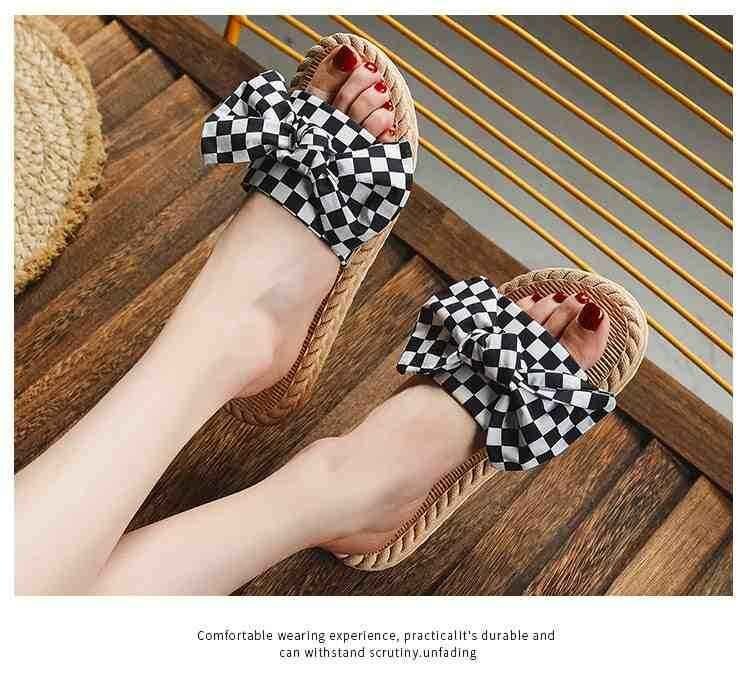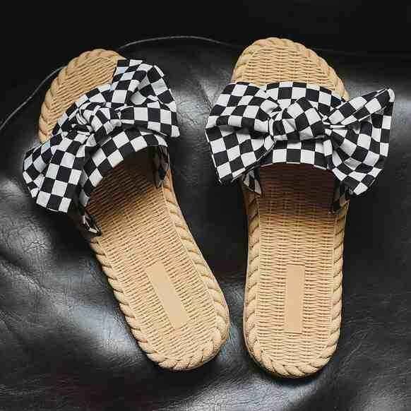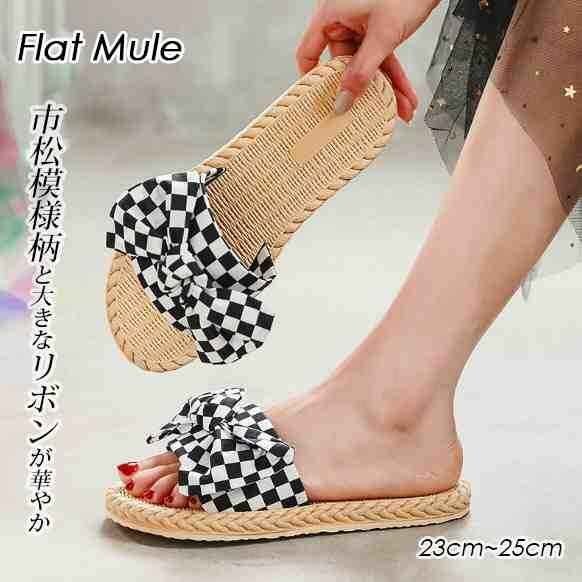 市松模様柄と大きなリボンが華やか フラットミュール