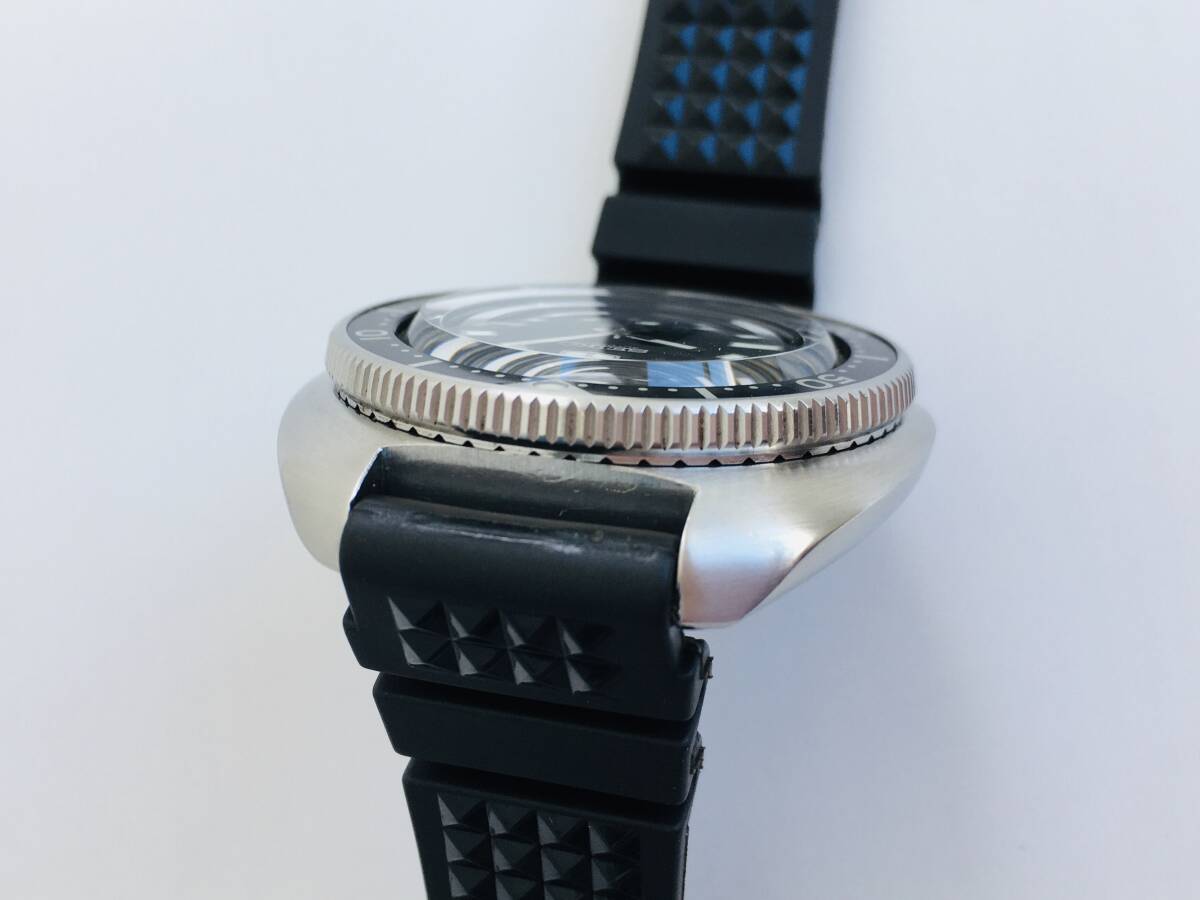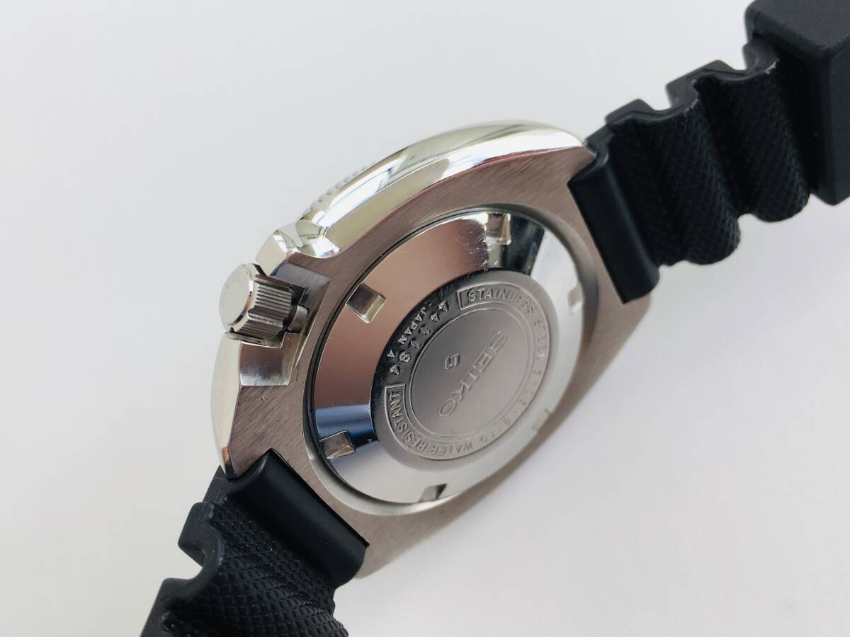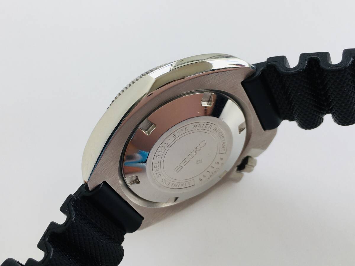 中後期型のRef.6105-8110はケースにリューズガードとリューズのロック機構が設けられ、3時の位置にデイト表示、赤色ドットセコンド、視認性の高いスクエア型のインデックスが特徴です。無骨なCライン系のケースと張り出したリューズガードはインパクトがあり格好いいです。中期と後期の大きな違いは裏蓋のデザインです。1971年に表記が「WATER PROOF」から「WATER RESIST」へ変わった為、中期型には「PROOF」と「RESIST」の2つの文字板が存在します。