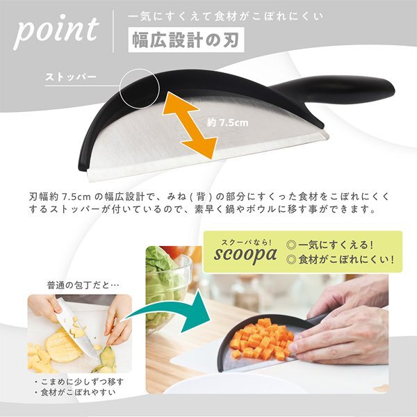 普通の包丁だと・・・こまめに少しずつ移す、何回もすくったり、ぱらぱら落ちてしまったりなどなど、そんな悩み事もスクーパなら一気に解決!(^^)