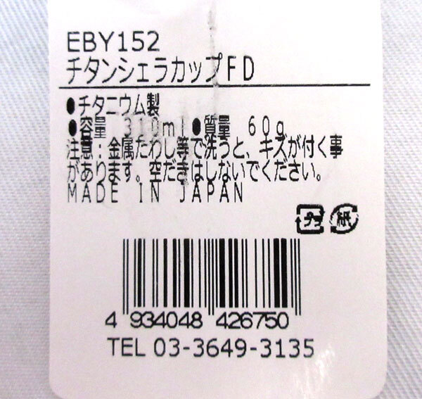 | 内 容 | ■アウトドア用品 チタン製シェラカップ ●エバニュー ・FD 310ml(約φ12×H4.5cm※持ち手含まず)日本製×2点 ●モンベル ・深型 250FH(約φ9.5×H5cm※持ち手含まず)×1点 ・深型 350FH(約φ10×H5cm※持ち手含まず)×1点 ◆総額 9680円相当 |
