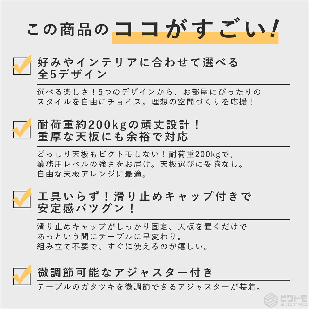 | 付属品 | 滑り止めキャップ | 特徴 | 主役であるテーブル天板を引き立てるデザイン。 | 注意 | ・テーブル用天板は付属しません。 |