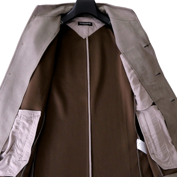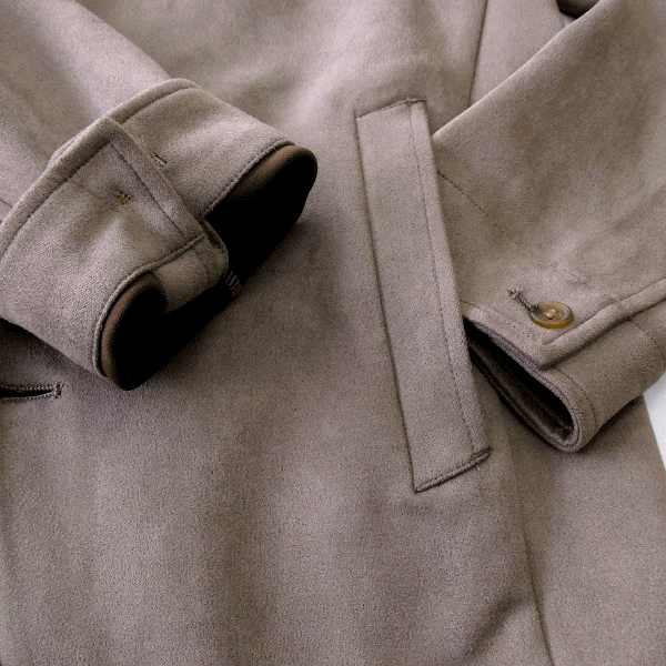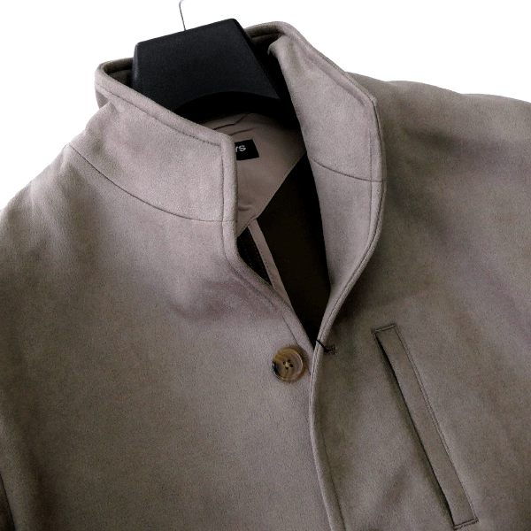 一枚仕立てで軽やかに羽織れるスタンドカバーオールジャケット。 衿端には目立たぬよう配されたフラットワイヤーを内蔵し、ニュアンスのある立ち上がりや絶妙な折り返しなど、着こなしに合わせた表情づくりが自在。 さりげないギミックが男のムードを引き立てます。 素材には、ポリエステルのマイクロファイバーをスウェード調に起毛させたカットソー生地を採用。 滑らかで手に吸いつくようなタッチと、控えめに艶めく上品な光沢が魅力です。 ジャージ素材ならではのストレッチが快適さを約束し、適度なハリを備えた生地感が、シルエットを美しくキープ。 ミニマルでありながら存在感のある佇まいは、大人のワードローブにこそ欲しい一着。 カジュアルにもクリーンにも振れる、今季の“主役ライトアウター”です。 【デザイン】 ・フロントは4つボタン ・裏地なし ・袖先は1つボタン(本開き) ・ノーベント ・衿にワイヤー入り |