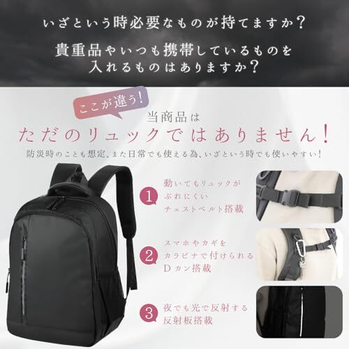 【防災士監修】unizomリュックは防災士監修で丈夫であらゆる機能が搭載されています。スマホやカギをカラビナをかけられるDカンや動いてもぶれにくいチェストベルトも装備し便利で動きやすいリュックサックです。また夜間には必須の反射板もついており通常のリュックとしても防災リュックとしてもお使いいただけます。