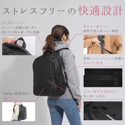 【軽量でも大容量】550gの軽量設計で、縦45cm×厚18cm×横32cmの大容量。メイン収納のほかに5か所の収納スペースを確保しています。両サイドには折りたたみ傘やペットボトルなどを収納できる♪