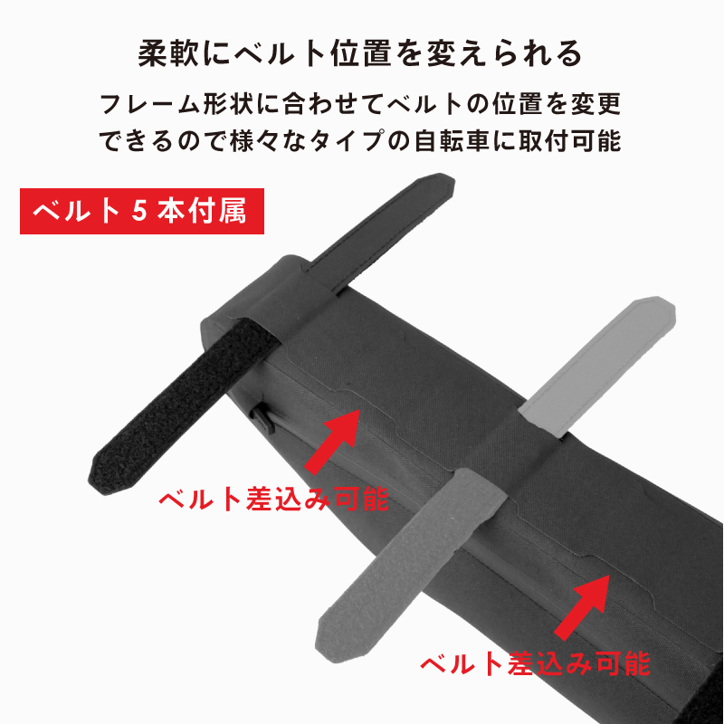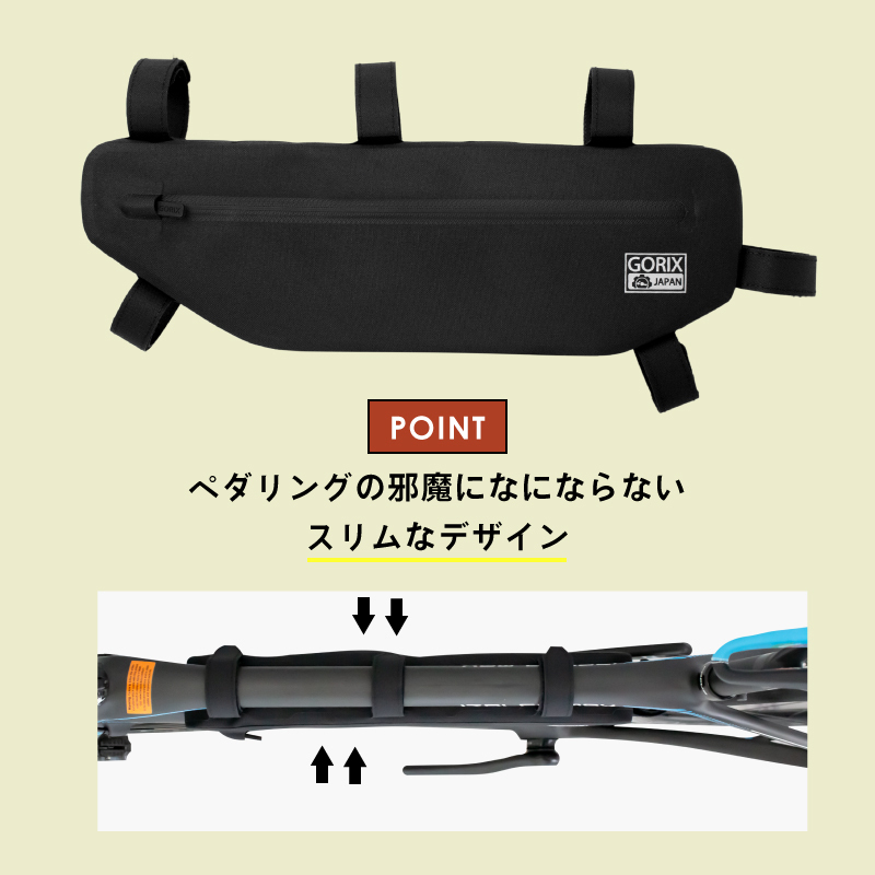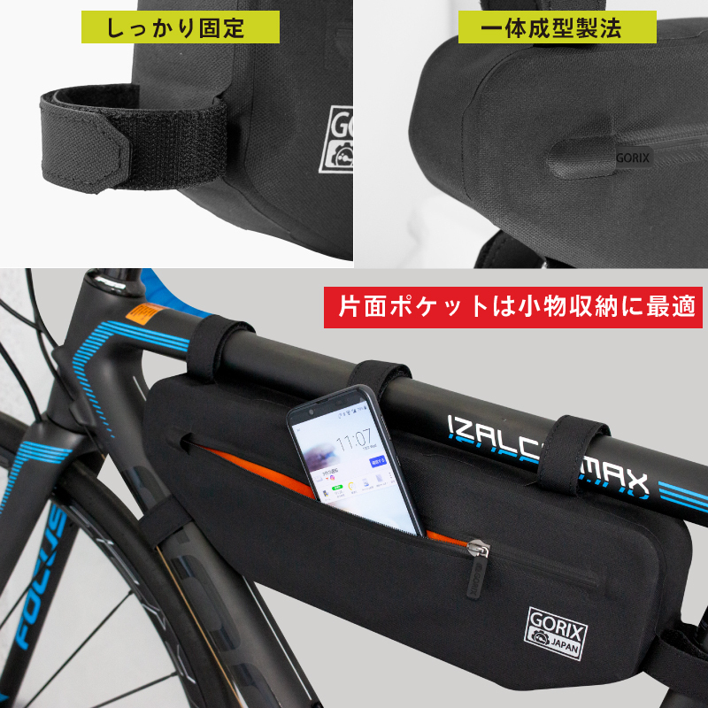 | ロードバイクやクロスバイク、マウンテンバイクなどのフレームに取付けできる自転車用フレームバッグ 空きスペースを有効活用して荷物を収納できます。 ジップは広く開ける事ができきるので取出しも楽々。 また防水対応で汚れにも強いのでサイクリングに最適です。 ・ペダリングの邪魔にならない幅サイズ ・柔軟に調整できるベルト位置 フレーム形状にあわせて組み替えできます。 ・水や汚れに強い素材 水漏れ防止高防水3層生地仕様 防水ファスナーでさらに防水効果をあげます。 破れにくい生地でタフなフレームバッグ ・ボトルケージなども入る容量1.8L 片面のサイドポケットはスマホなどの収納に ・夜間安心の反射ロゴ 夜間反射機能・事故防止などの安全対策に 暗闇でライト等の光に反射して存在をアピールし 追突などのリスクを軽減 サイズ:約長さ40x高さ12.5、幅6cm 重量:約390 g 商品内容:バッグx1、テープx5、説明書x1 附属ベルト取付可能径:約φ3-5cm 最大容量:約1.8L 自転車に取付位置:フレーム 防水仕様:防水レベルIPX4 適用フレームMAXサイズ:MTB/ロードバイク/クロスバイク ※自車のフレームサイズと合うとか必ず確認してください! 《ご注意》 ・商品は入荷によりキズがある場合があります。 保証対象外になりますのでご了承お願い致します。 ・ディスプレイ環境により実物と色が異なる場合が有ります。 ・入荷時期により予告無く一部仕様変更する場合が有ります。 ・車種、サイズによって取付できない場合があります。 形状やサイズなどををご確認の上ご購入下さい。 | |