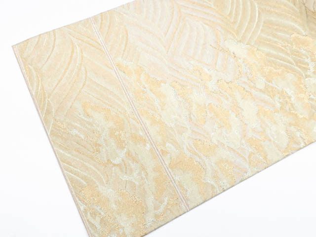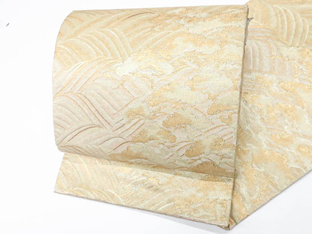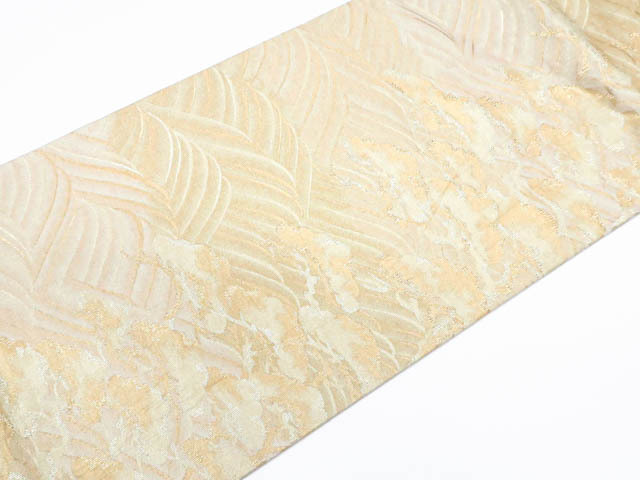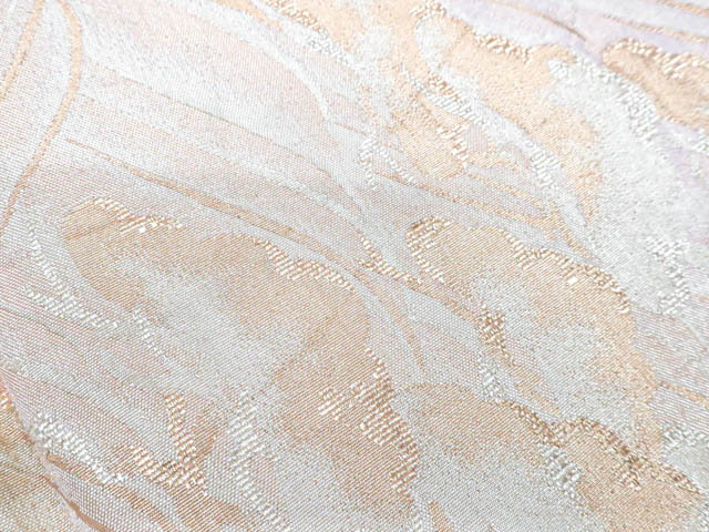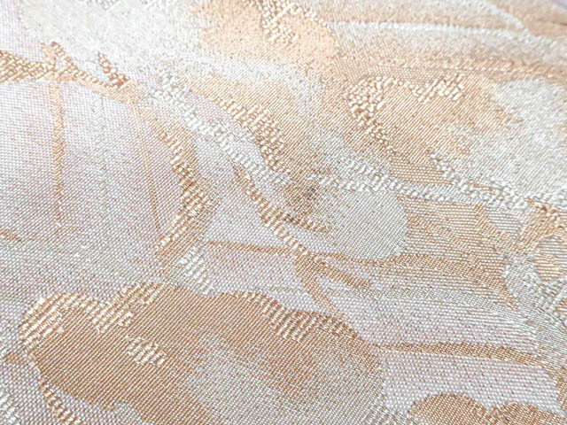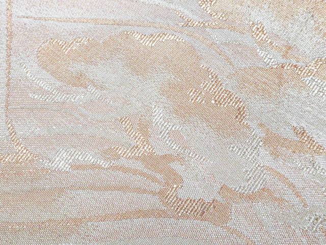 リサイクル商品の為、所々擦れ、折れ山薄汚れがございますがご着用いただけると存じます。 地色は金です。 1枚目の画像が近いお色かと思われます。 素材は正絹です。 |