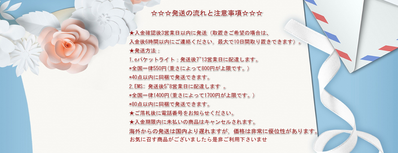 4.如果您的货品寄往日本本地,您在包裹签收前,请务必确认外包装是否有变形、破损、包装受潮、纸箱变色、纸箱重新封胶;商品是否破损、缺货。如有上述状况,您有权要求开封验货,以确认商品完整。如发现商品破损或少件,您务必用手机拍下破损情况,要求在快递单上写下实际情况且有权选择拒收,由快递公司来承担破损责任。并于当天告知我们,如未反馈,日拍网默认您货品完好,不承担任何责任。如果物品选择第三方物流(例如:第三方转运),请自行与第三方签订责任风险