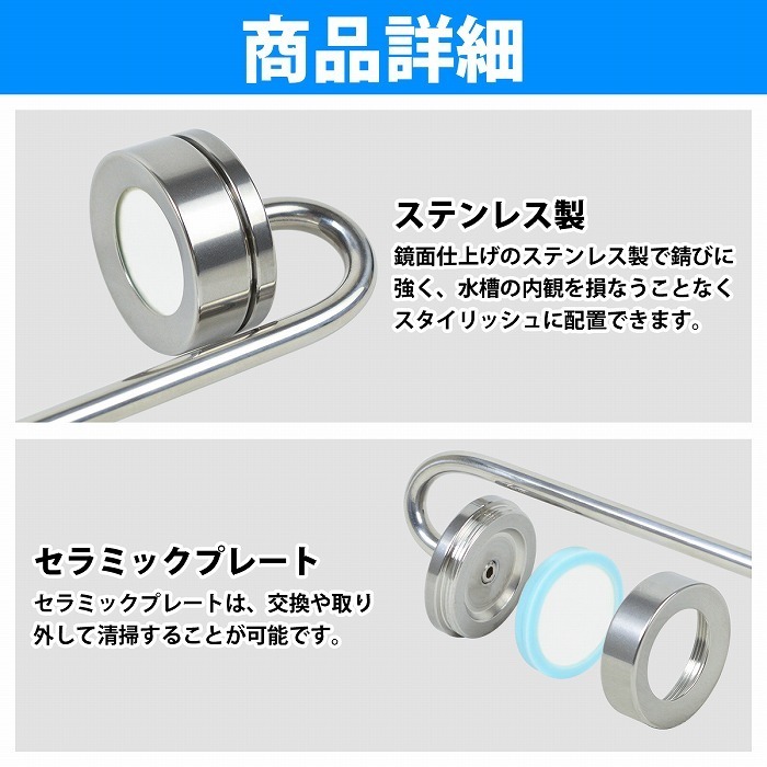 鏡面仕上げのステンレス製で錆に強く、水槽の内観を損なうことなくスタイリッシュに配置できます。