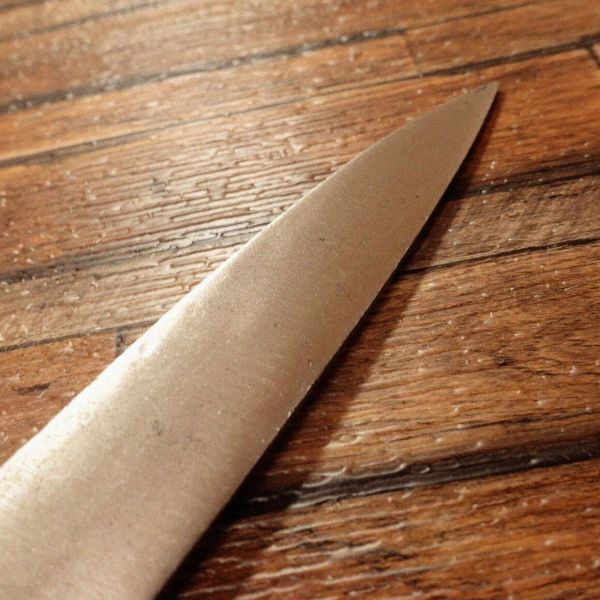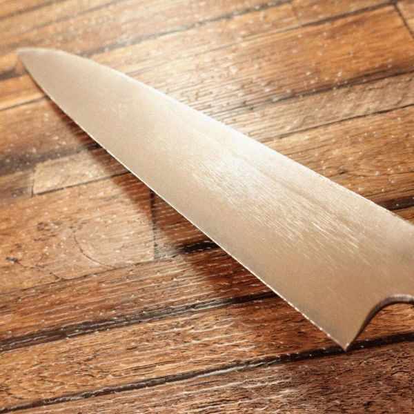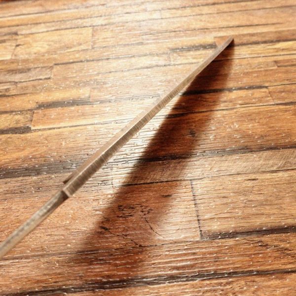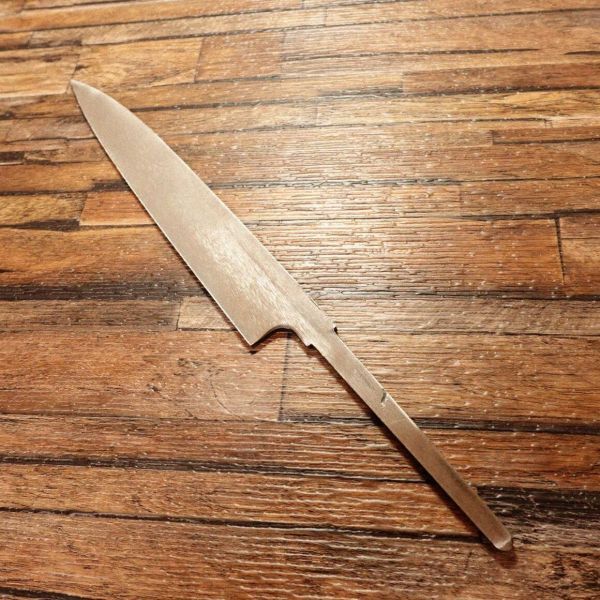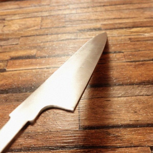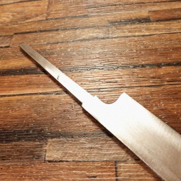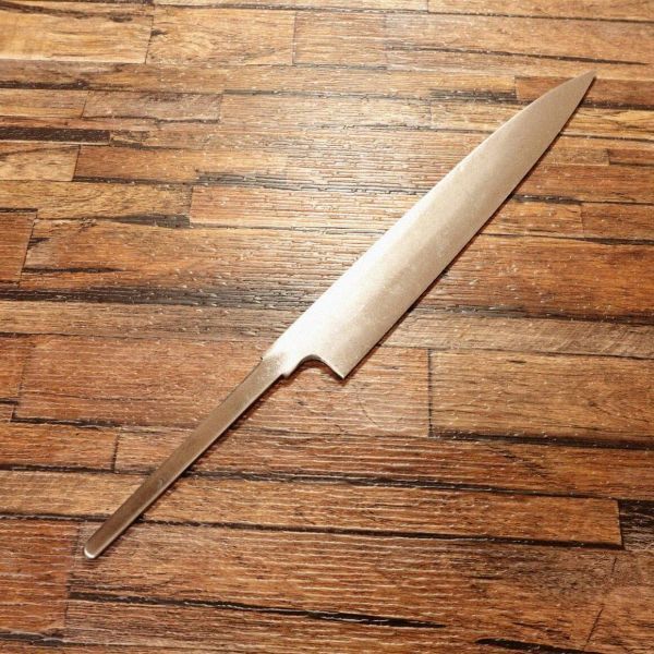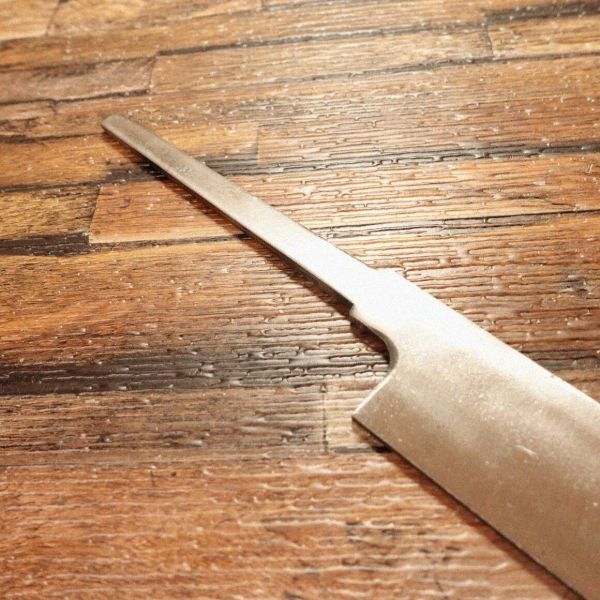 刃のついていない、これから研ぎを入れて包丁にしていく素材です。DIYで自分だけの包丁をおつくりになりたい方にオススメですね。同時に入荷した同じデッドストックには安来鋼白二の銘が入っておりましたし、お手入れした際に同じ素材だろうと思いましたので、おそらく白二鋼ではないかと思います。