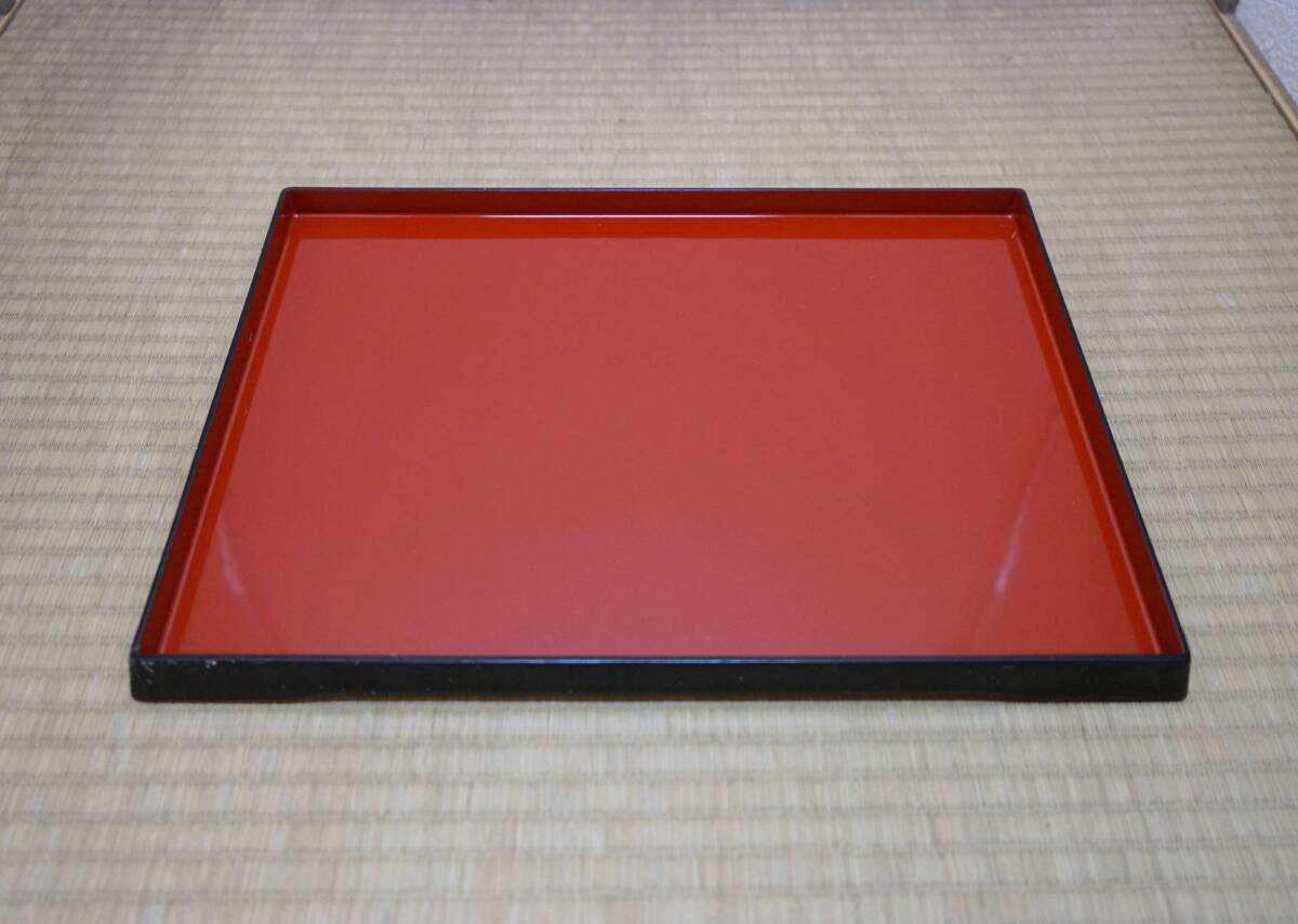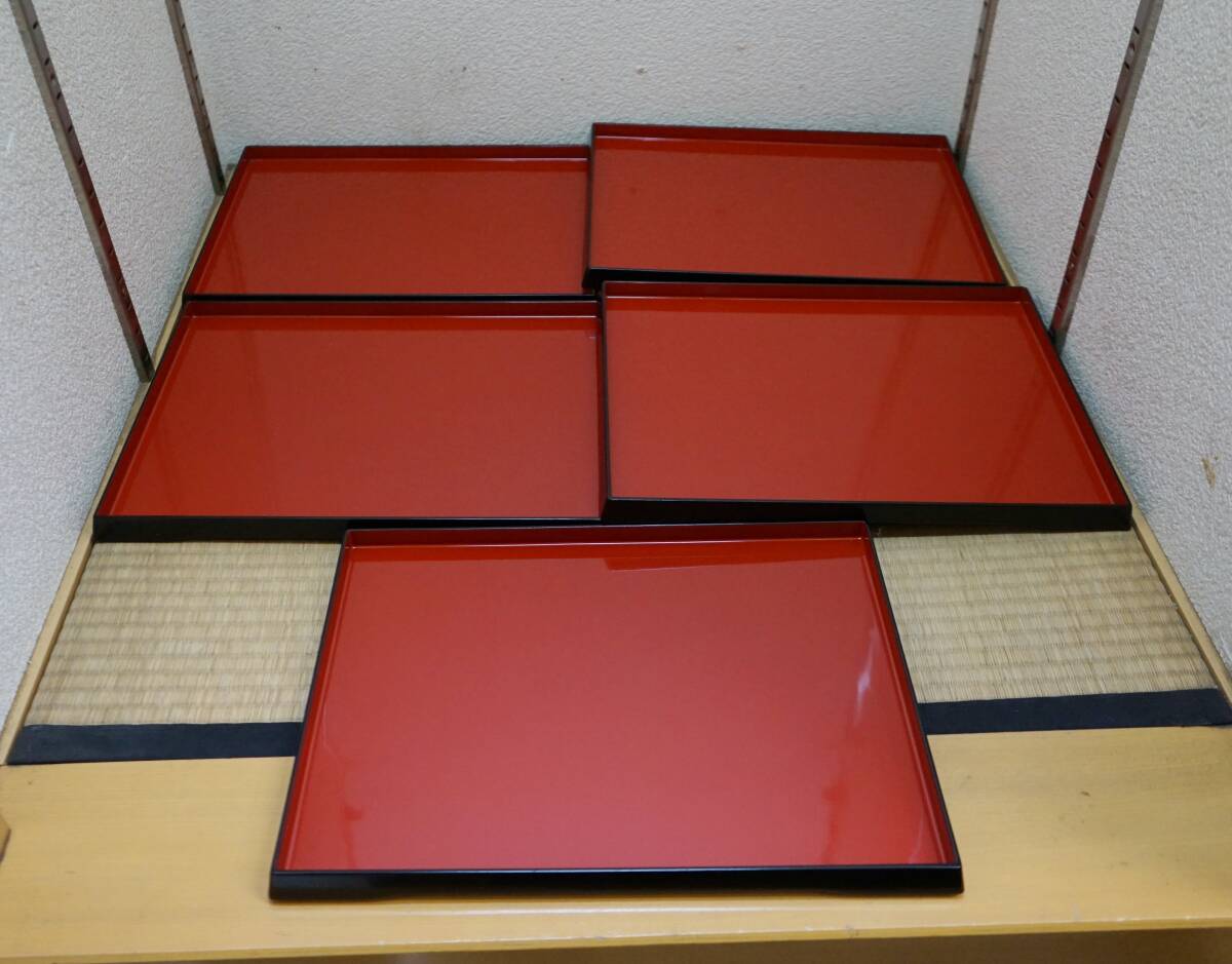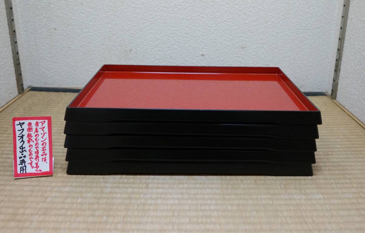 | ◎西村道具店◎即決!一発落札!朱塗縁黒の無地懐石膳5客揃★木製・本塗★木箱付★巾38.5cm! | ||