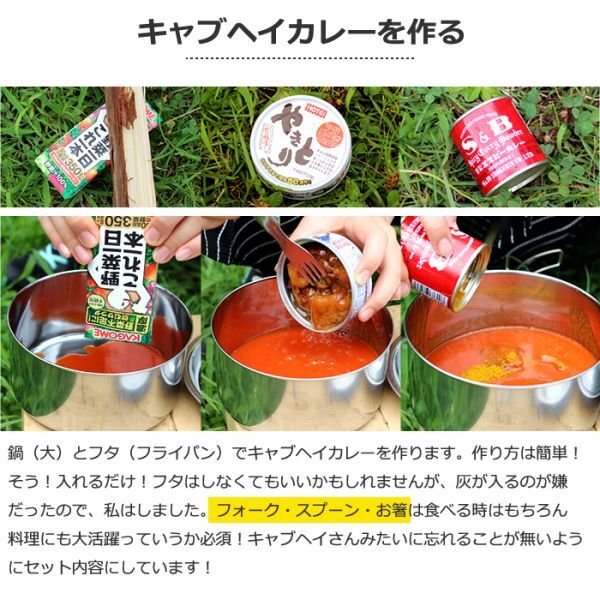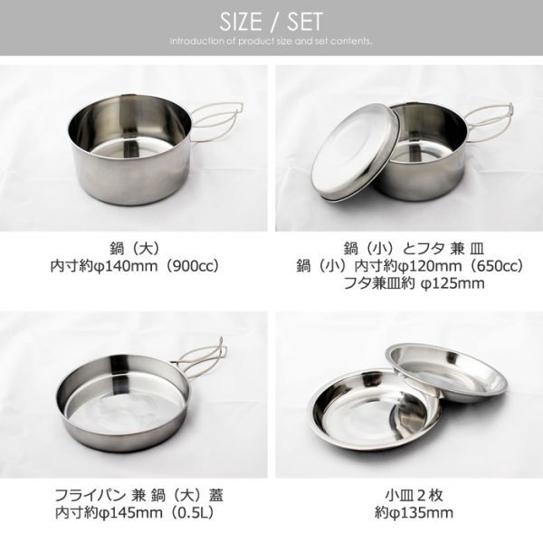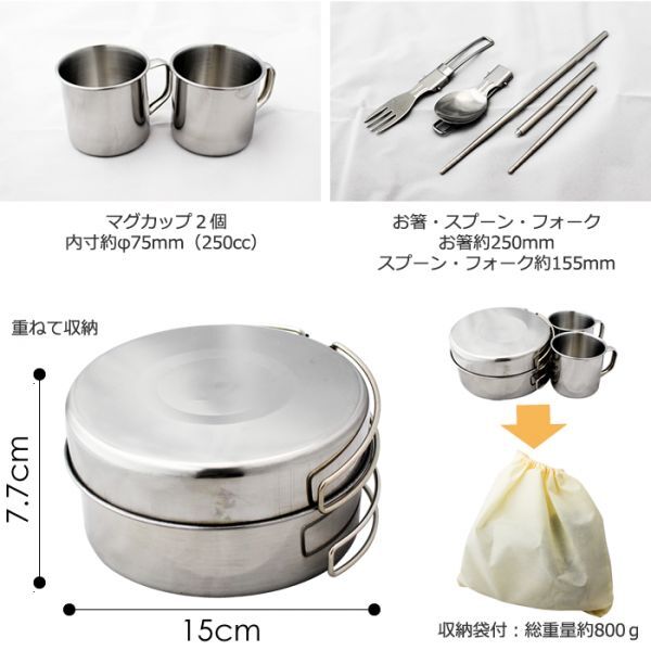 鍋大・鍋小・フタ兼用フライパン・フタ兼用皿・小皿×2・マグカップ×2・お箸・スプーン・フォーク・収納袋・レシピ