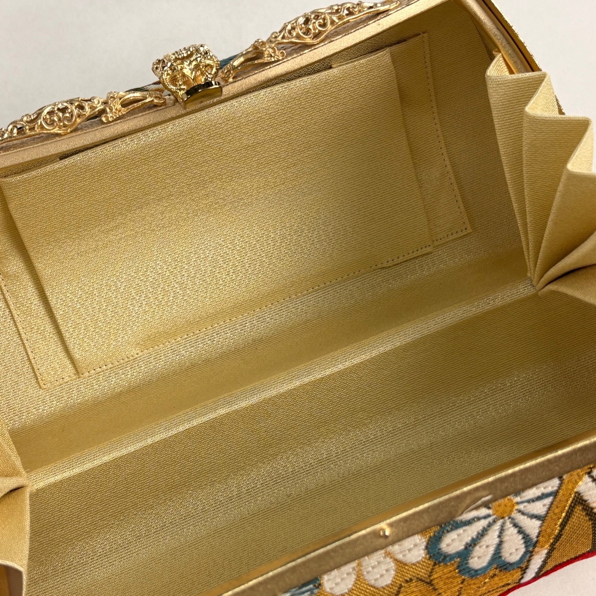 | 縦11.5cm 横23cm 奥行10.5cm フォーマルな装いにお似合いの和装バッグでございます。 パーティなどの華やかなシーンに最適なお品でございます。 目立ったシミ汚れは無くリユース品としては状態の良いお品でございます。 沢山の商品の中からご覧いただき誠にありがとうございます。 | 状態ランク |