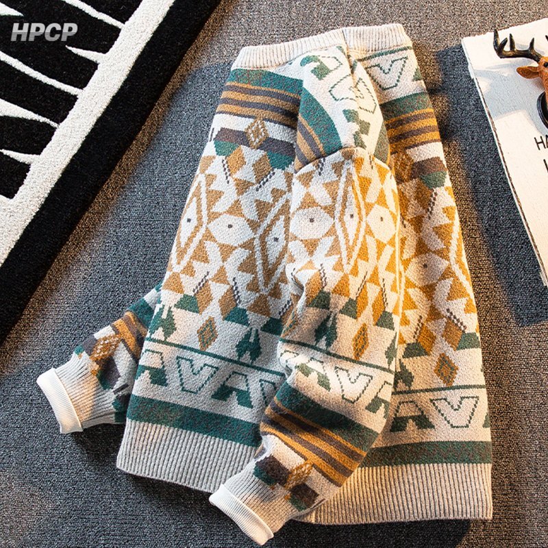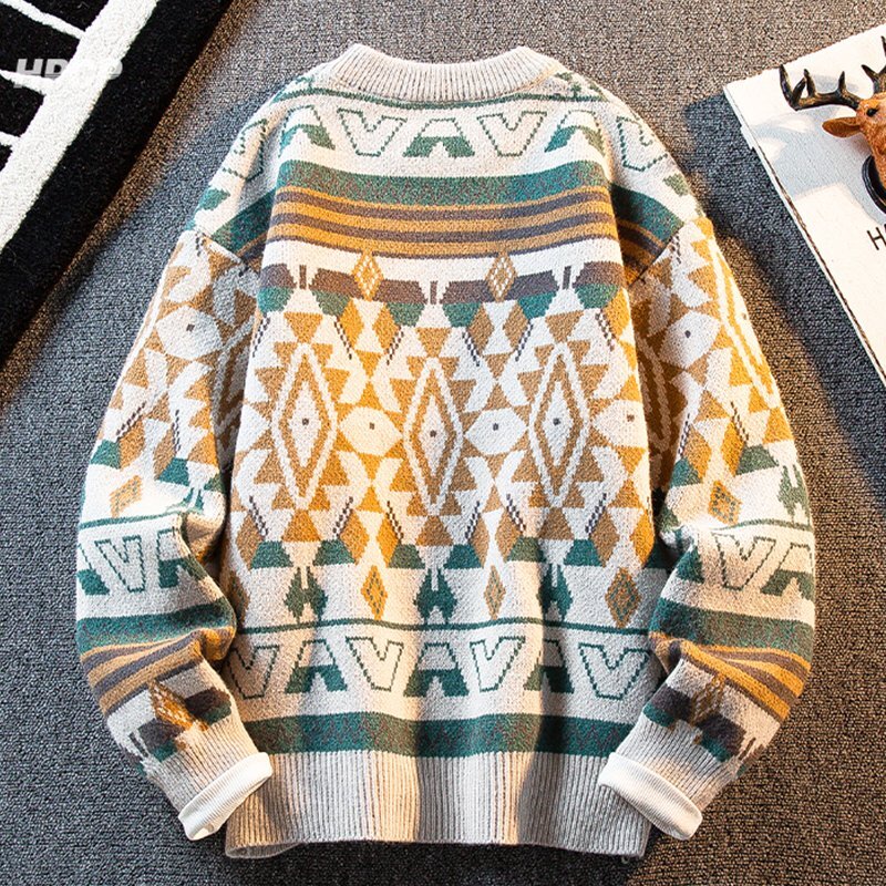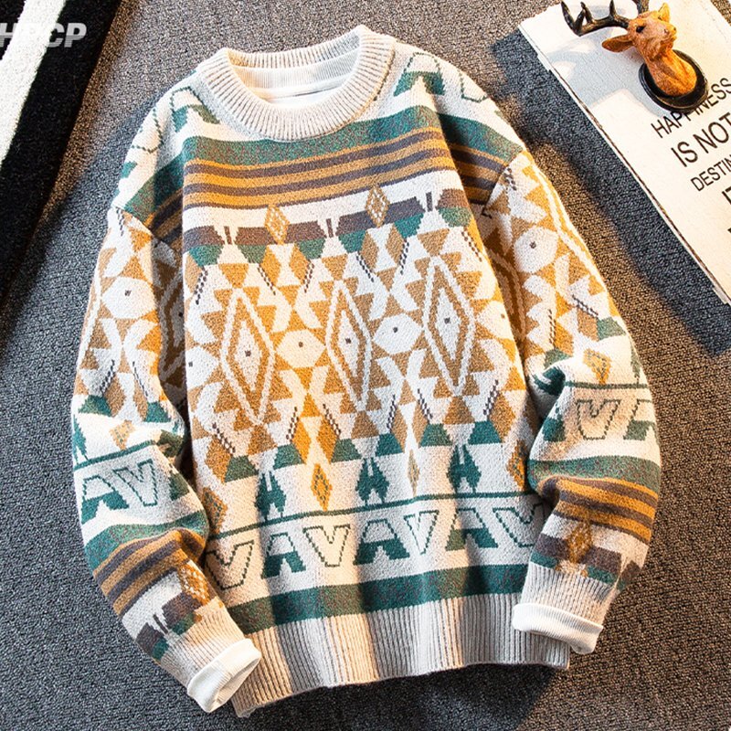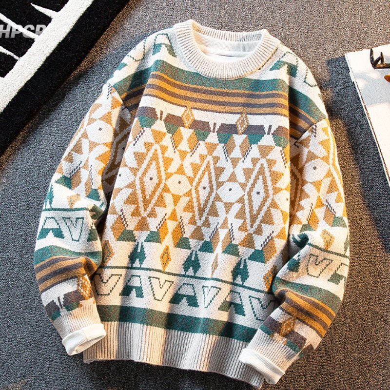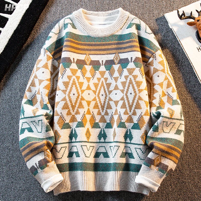 個性◆イタリア製造 メンズ 古ジャカードニット 秋冬 厚手 保温 クルーネックセーター 提花デザイン 男性用高級プルオーバー M/46 fz143