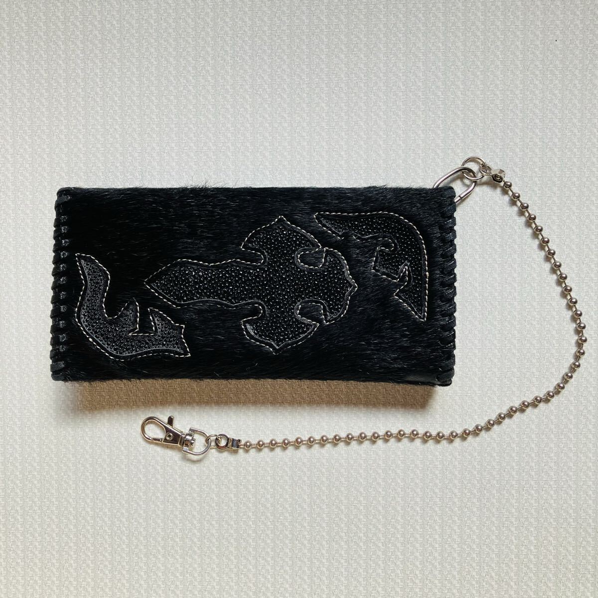 刺繍デザインの黒い長財布、カードスロットとボールチェーン付き。