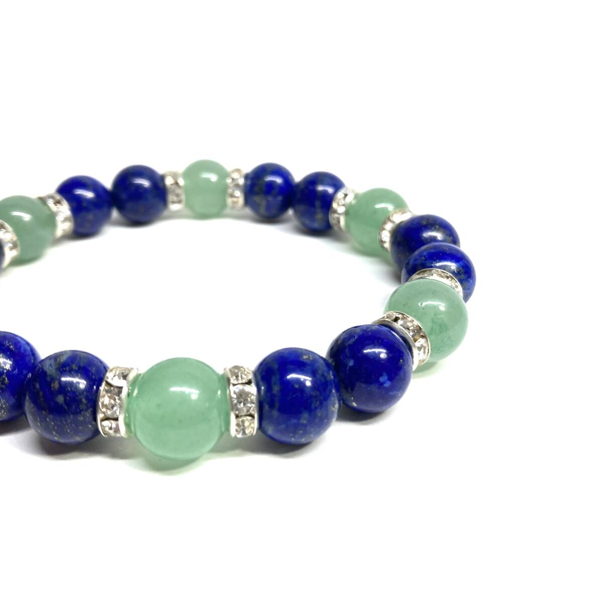 こちらは、ラピスラズリとアベンチュリンを組み合わせたパワーストーンブレスレットです。間にはロンデルを挟み高級感あるデザインに仕上げております。石大きさは腕にも馴染みやすいように10mm玉で内径約18cm(伸可能)です。(サイズ変更の場合は取引ナビにてご連絡をお願いします。) 数に限りがございますので気になる方はお早めにどうぞ。
