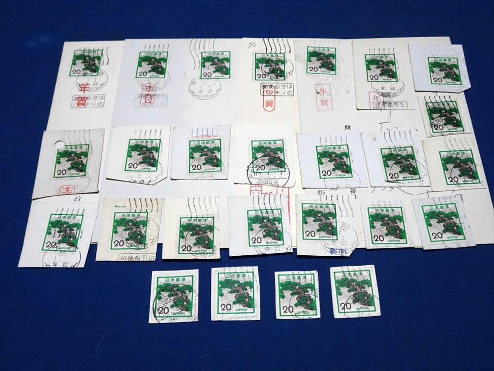 新動植物国宝20円松を貼った私製年賀葉書5通と、切手部分切り抜き21点です。いずれも唐草年賀印あるいは櫛型年賀印が押印されています。満月のものもあれば、辛うじて読めるものなどいろいろです。