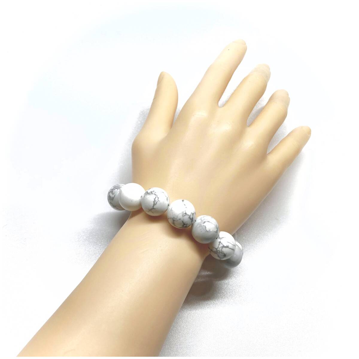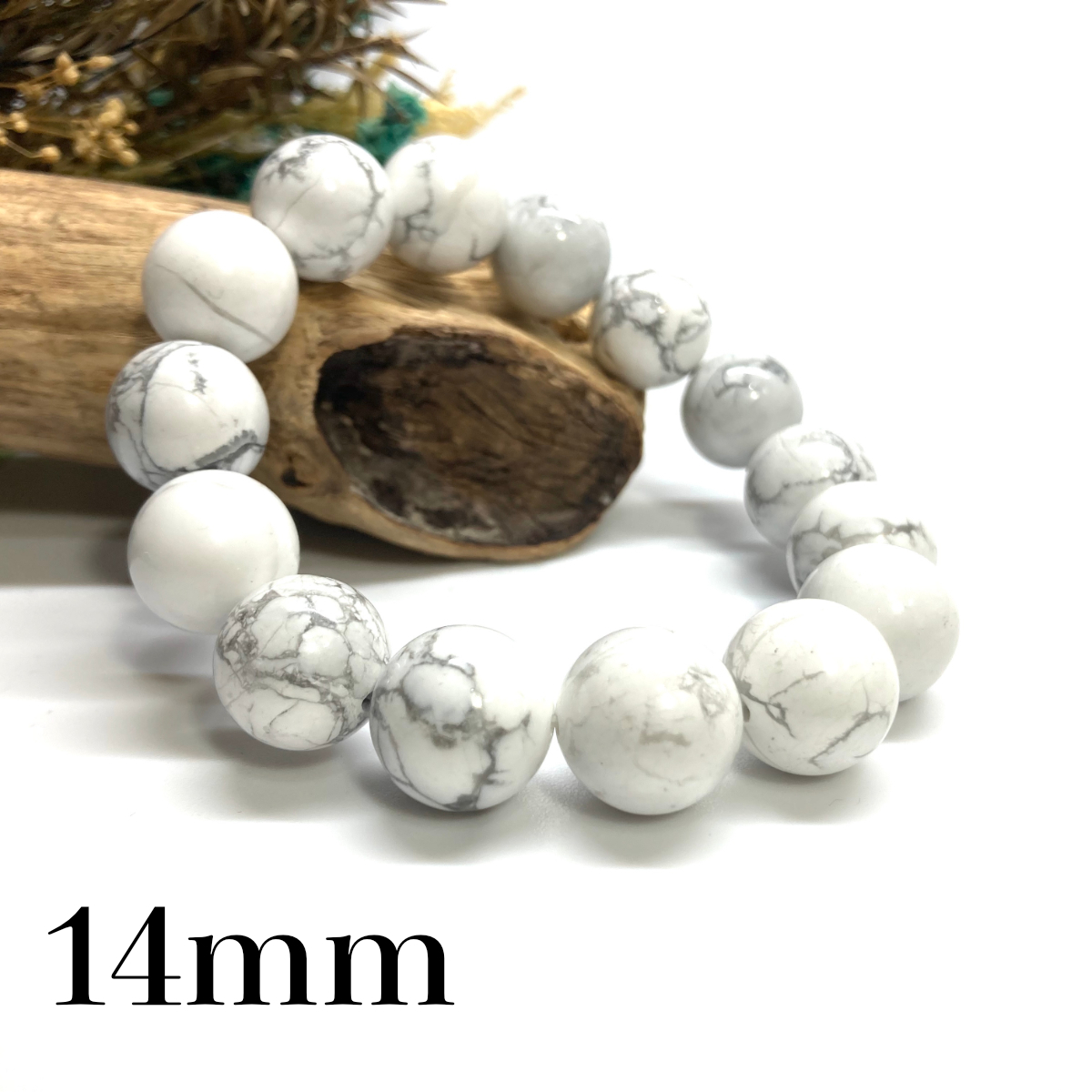 こちらは、ハウライトの14mm玉を使用したパワーストーンブレスレットです。シンプルなデザインですのでどんなコーディネートとも合わせ易いブレスレットです。インパクトがある14mm玉を使用して内周約17cmです。パワーストーンを付けてる方へのプレゼントにもお勧めです。14mmサイズのリクエストが多々ありましたので少量ですが販売しました。気になる方はお早めにどうぞ。