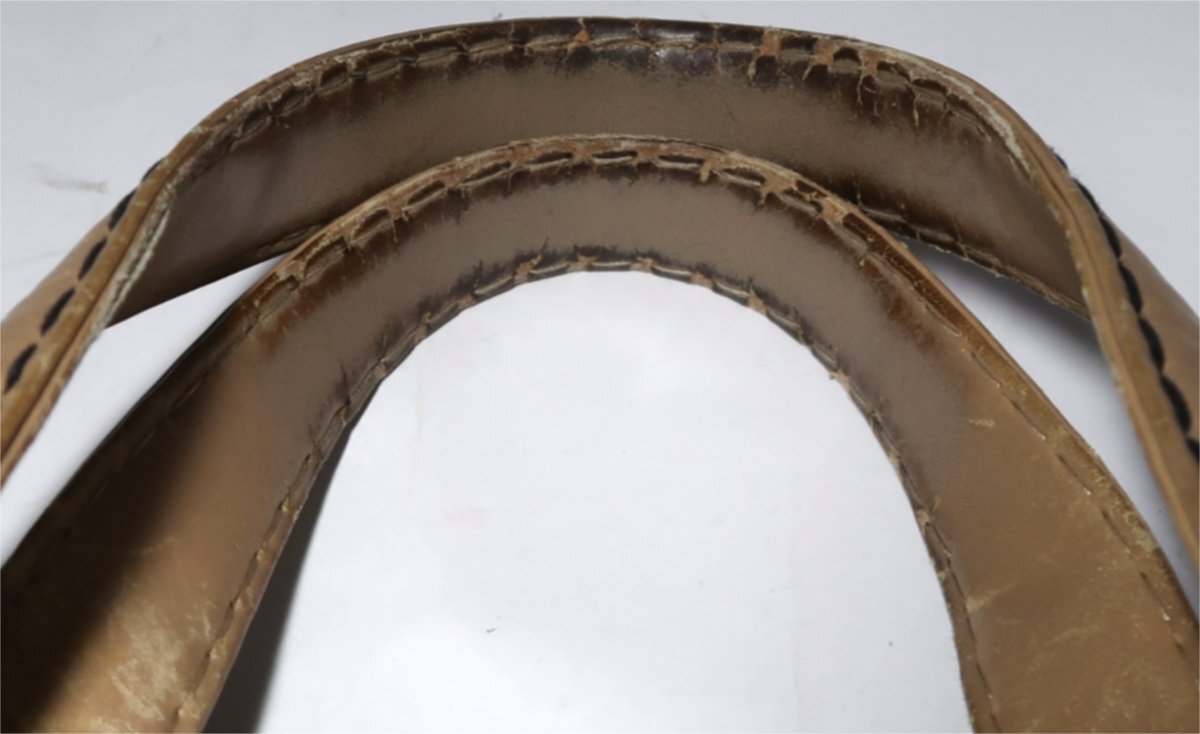 出品は画像の物が全てです。バックに顔を近づけると香水の匂いがします。なんの香水かわかりません。バックは使用品ですので型崩れ、シワ、汚れや擦れがあります。4隅周りに擦り傷あります。持ち手はシワや擦れあります。また表面の裏側の生地が剥がれていたり、ひび割れている箇所があります。バックの内側は擦れはあります。ひどい汚れはないです。バックの内側は内張に擦れや汚れがあります。バックのサイズはW32xH20xD114cmくらいです。シリアル番号はモザイクをかけています。後は画像をご覧ください。分かることは以上です。