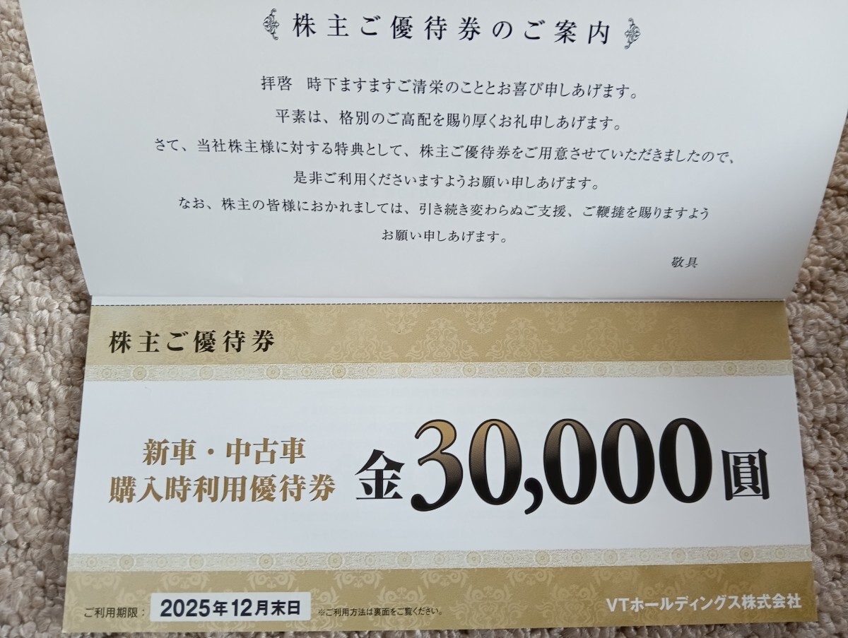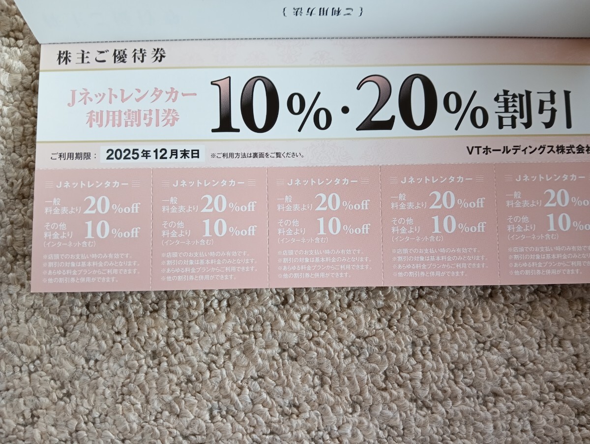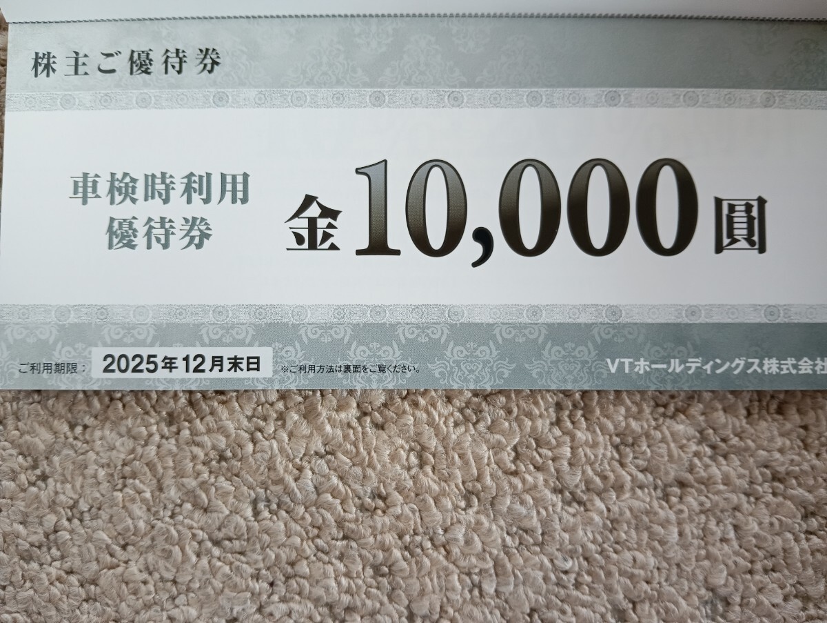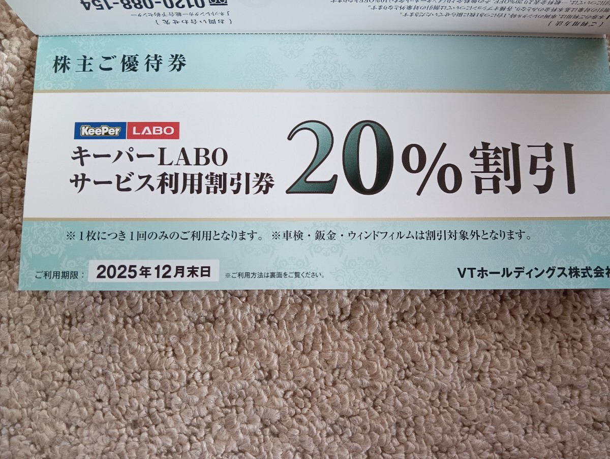 VTホールディングス株主優待券 有効期限2025年12月31日 ①キーパーLABO利用割引20%②新車中古車購入時利用優待券30000円③車検時利用優待券10000円④Jネットレンタカー利用割引券10%20%割引 発送は普通郵便110円を予定しています。有効期限まで日数がありませんので、迅速に対応を心掛けますのでよろしくお願い致します。