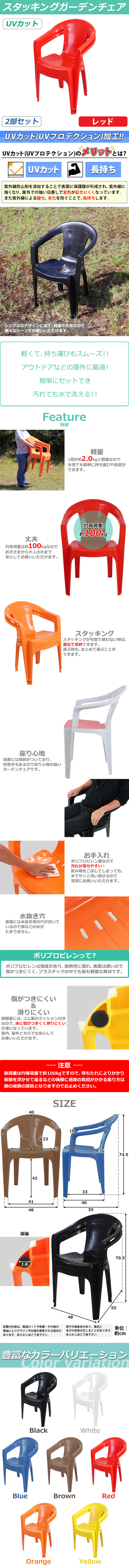 ●UVカット加工によって屋外での強い日差しで変色しにくくなっています。 ●紫外線による酸化、劣化を防ぐことにより、長持ちする作りになっています。 ●スタッキング構造なので重ねる事が可能なので、収納やまとめて運ぶ際にも大変便利です。 ●座面には水抜き穴が空いているので雨などの水がたまりません。 ●本体重量は約2kgと軽量タイプなので、女性でも軽々持ち運べます。 ●材質は、軽量、安全、防水のポリプロピレン(PP)です。 ●完成品なので届いたらすぐにお使いいただけます。 注意! 背もたれによりかかり前脚を浮かせて座るなどの後脚に過度の負担がかかる座り方は脚の破損の原因となりますのでお止めください。 ■重量:約2kg(1脚あたり) ■均等荷重:約100kg ■材質:PP[ポリプロピレン](本体)、ゴム(脚裏) ●商品のカラーはレッドとなります。 ●新品商品ではありますが、輸入商品の為、多少の擦り傷などがある場合がございますので、ご納得の上ご購入下さいませ。 ●ご購入後、お客様ご都合によるご返品、ご返金等は一切お受け致しておりません。 ●本商品を使用した際に発生したトラブル、事故につきまして、当社は一切の責任を負いません。ご使用に関しましては、全て自己責任にてお願い致します。 |