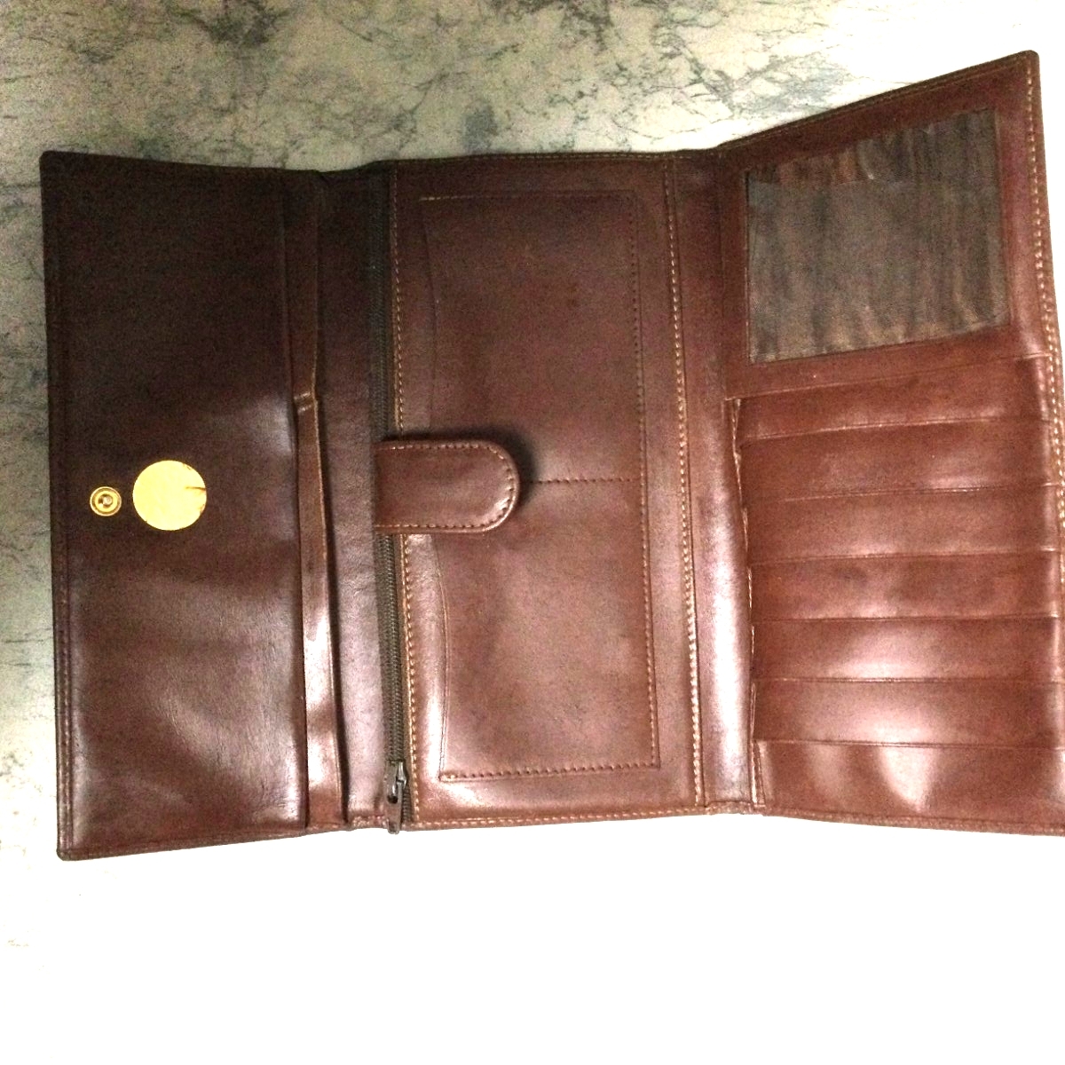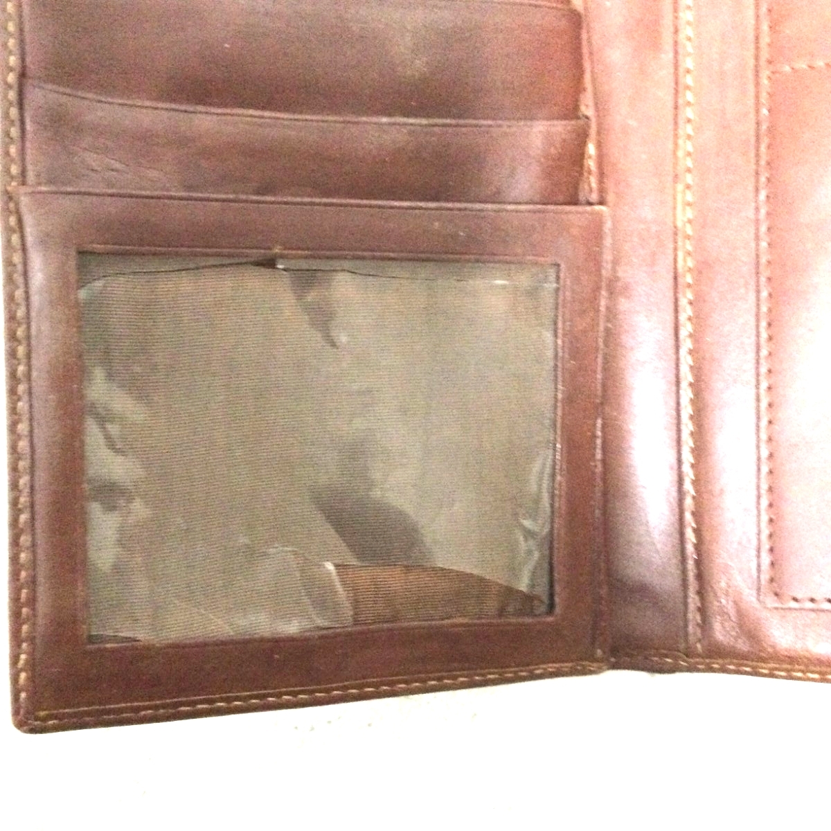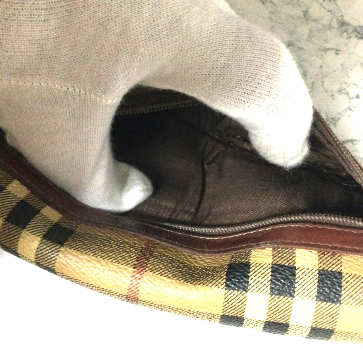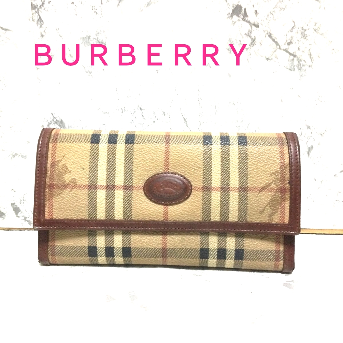ブラウンレザーのBURBERRY長財布、チェック柄デザイン、カードポケット付き。