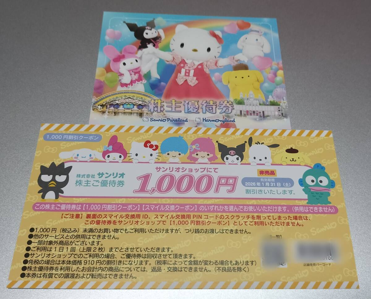 サンリオの株主優待券1枚とお買物割引券1000円分です。