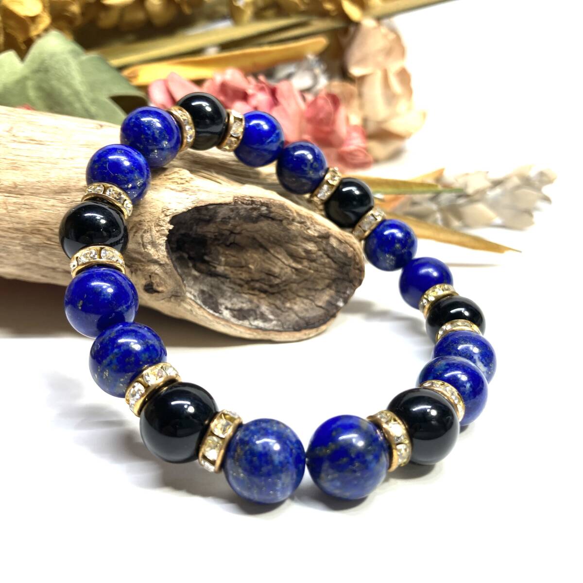 こちらは、ラピスラズリとオニキスを組み合わせたパワーストーンブレスレットです。間にはロンデルを挟み高級感あるデザインに仕上げております。石大きさは腕にも馴染みやすいように10mm玉で内径約18cm(伸可能)です。(サイズ変更の場合は取引ナビにてご連絡をお願いします。) 数に限りがございますので気になる方はお早めにどうぞ。