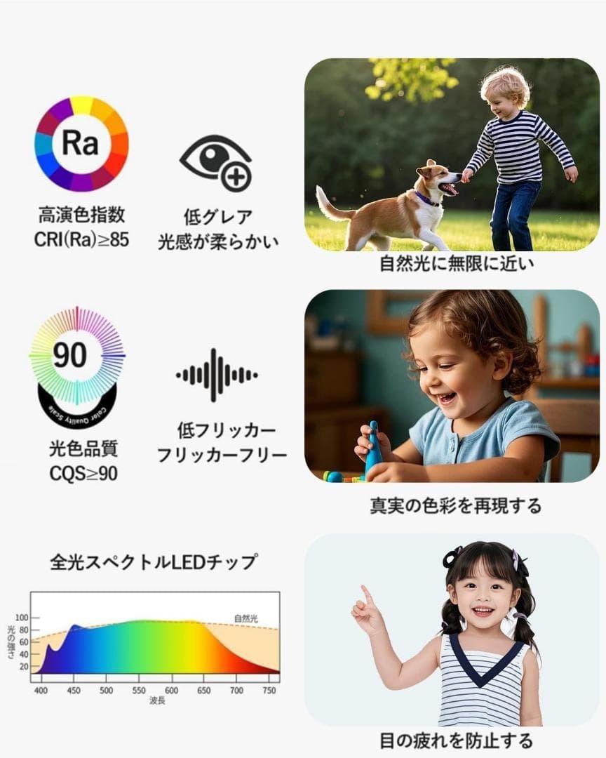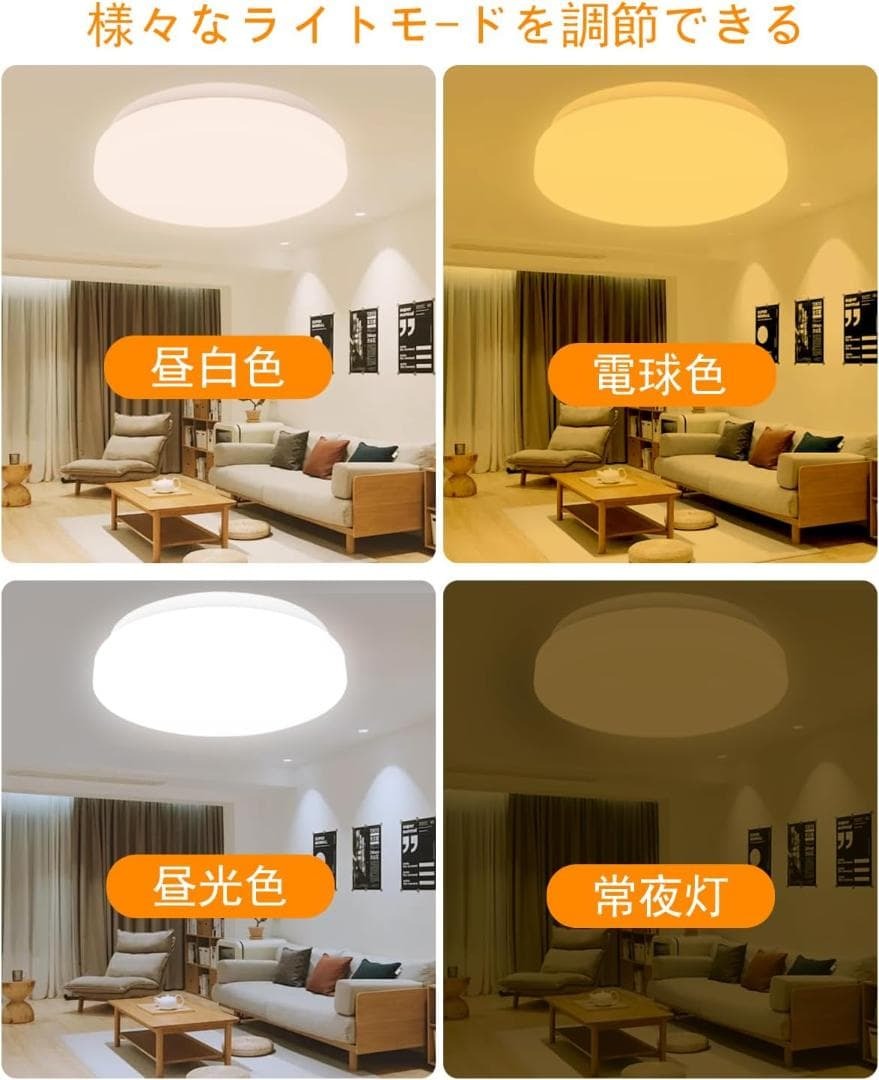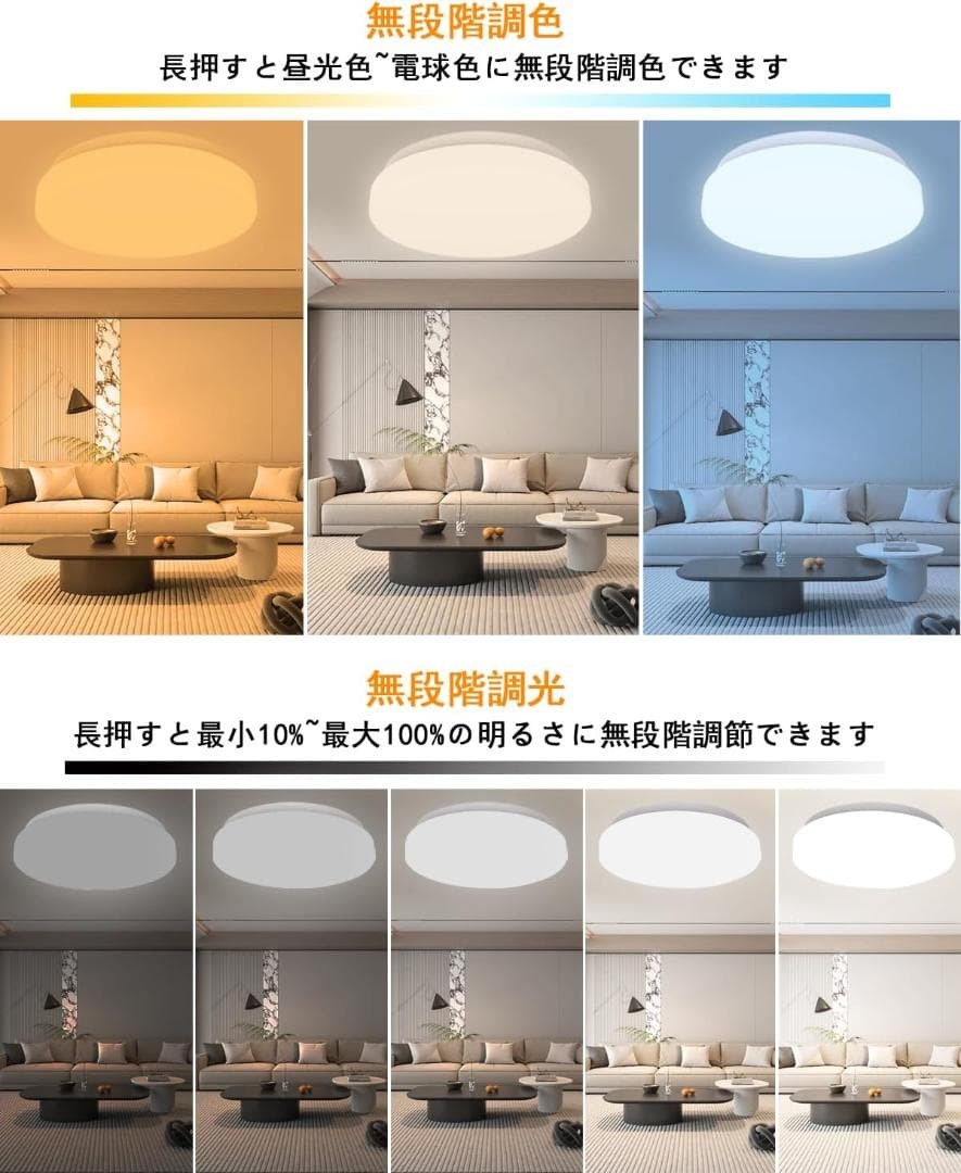 電球色から昼光色まで自由に切替でき、寝室や玄関、リビングまで幅広く対応。
