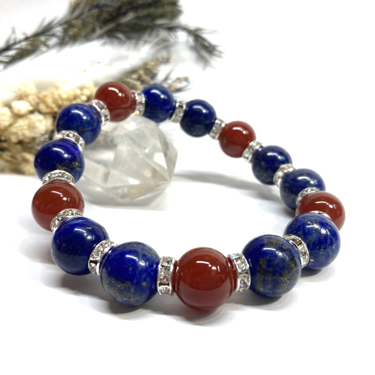 こちらは、ラピスラズリと赤瑪瑙を組み合わせたパワーストーンブレスレットです。間にはロンデルを挟み高級感あるデザインに仕上げております。程よくインパクトがある12mm玉を使用して内周約18cmです。(サイズ変更の場合は取引ナビにてご連絡をお願いします。) 数に限りがございますので気になる方はお早めにどうぞ。