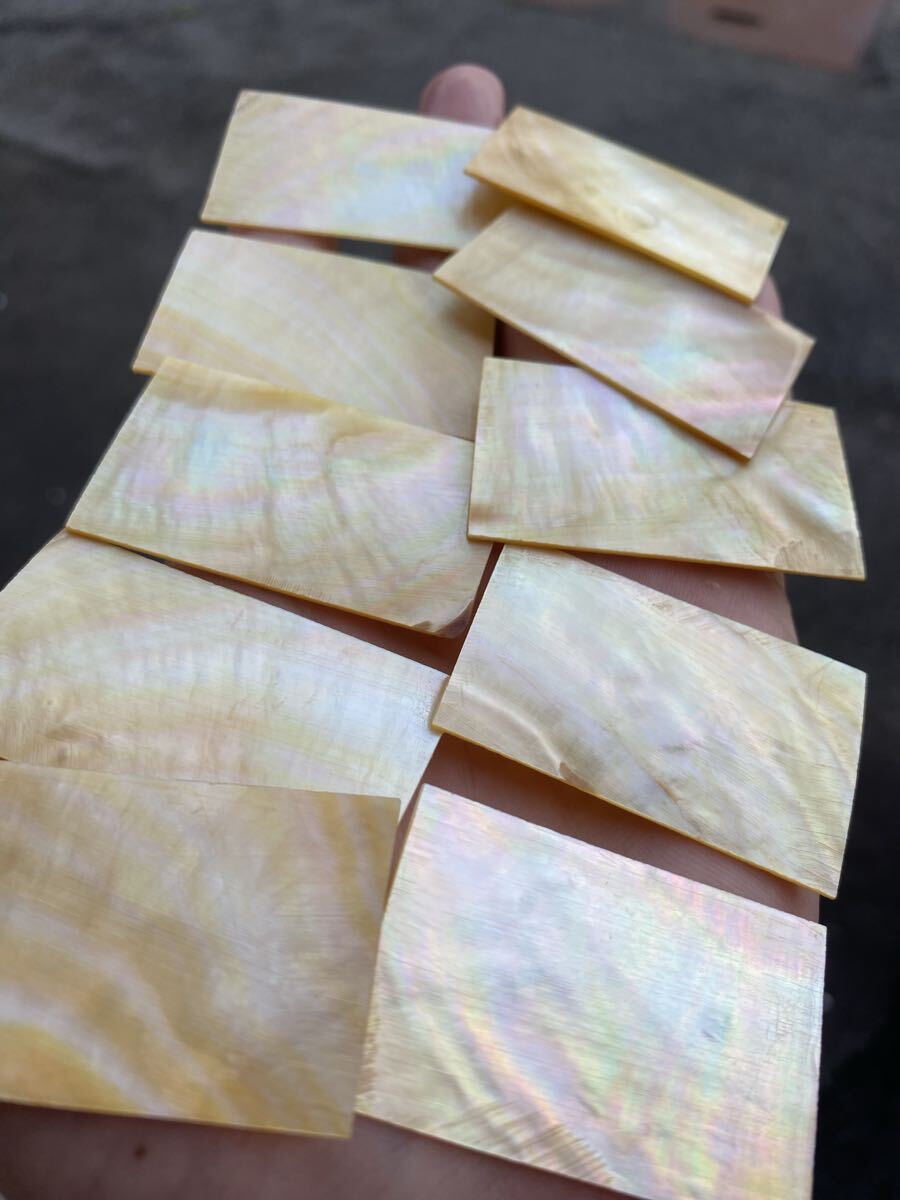 * 活かし貝殻を小さなパーツに切り分け、磨いて平らに仕上げてます