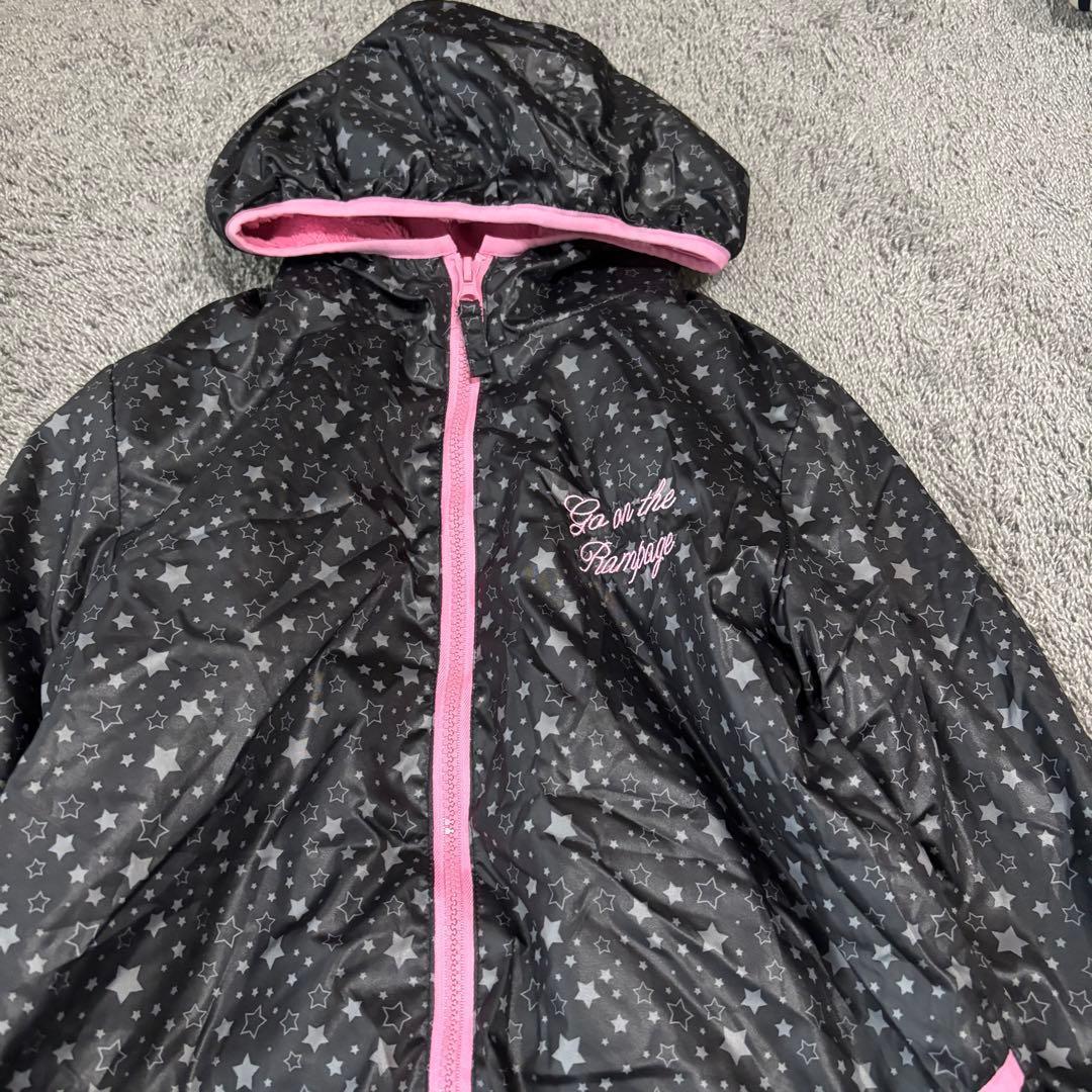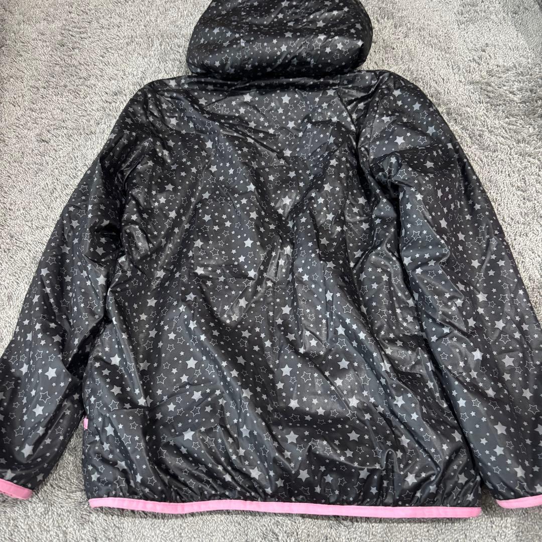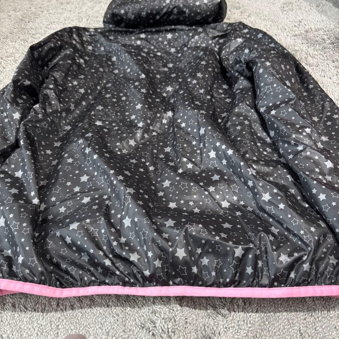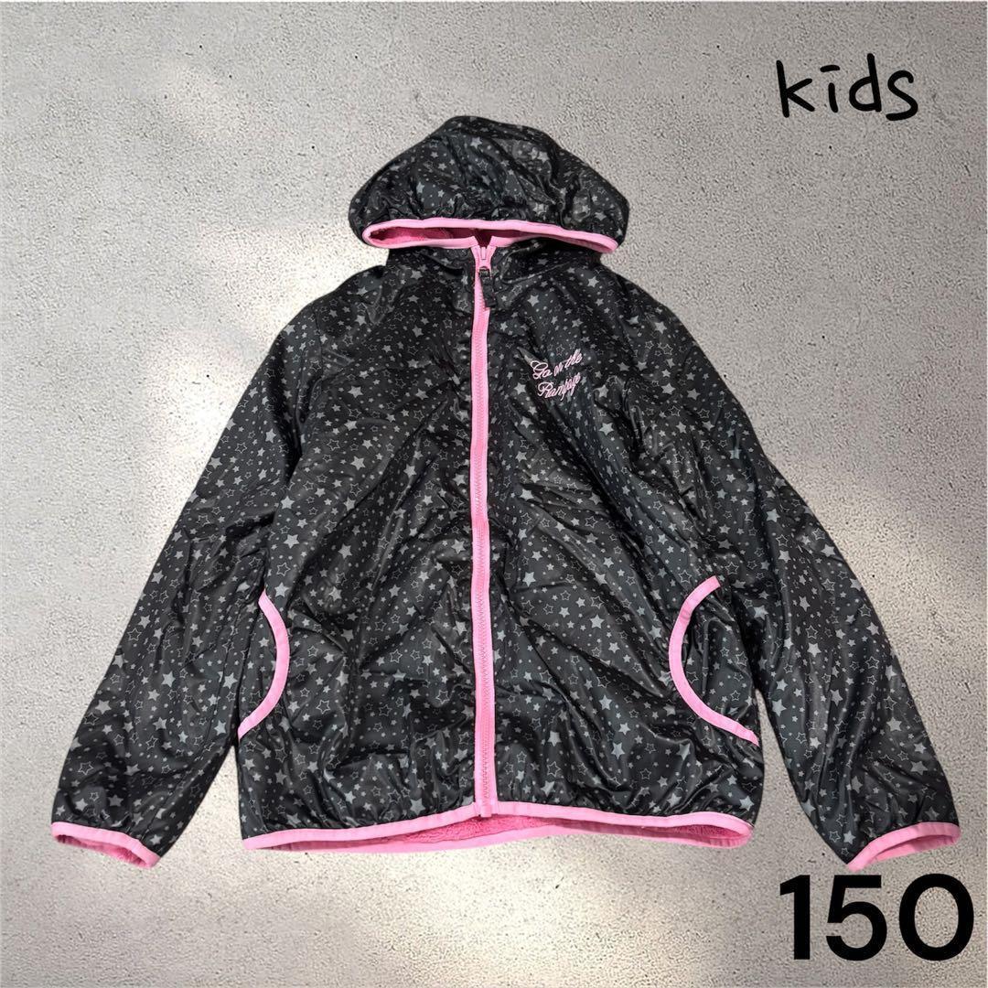 星柄デザインの黒とピンクのジャケット、サイズ150、フード付きでポケットあり。