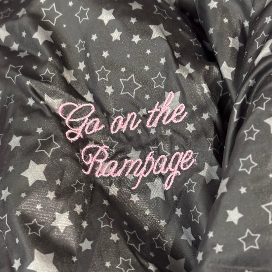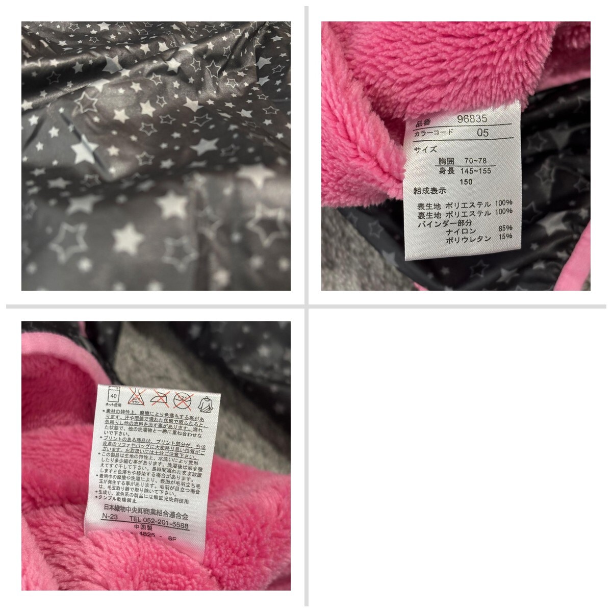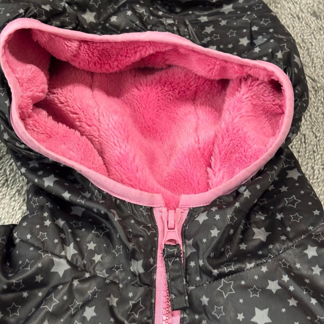 星柄デザインの黒とピンクのジャケット、サイズ150、フード付きでポケットあり。