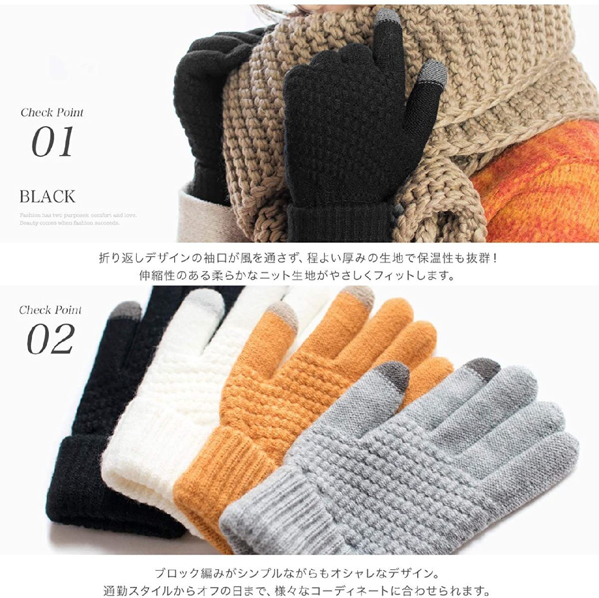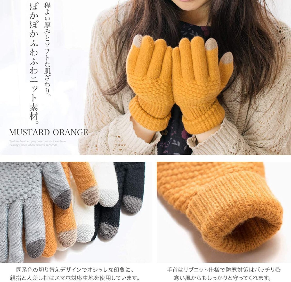 【手首の部分もしっかり守る】外気が入ってきやすい手首の部分は防寒性に優れた二重構造になっております。また、ふんわりと柔らかい厚手のニットが寒さからしっかり守ってくれます。
