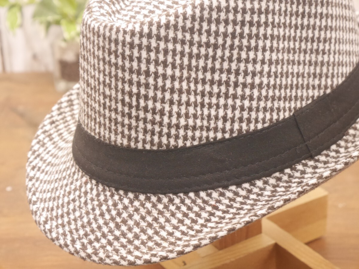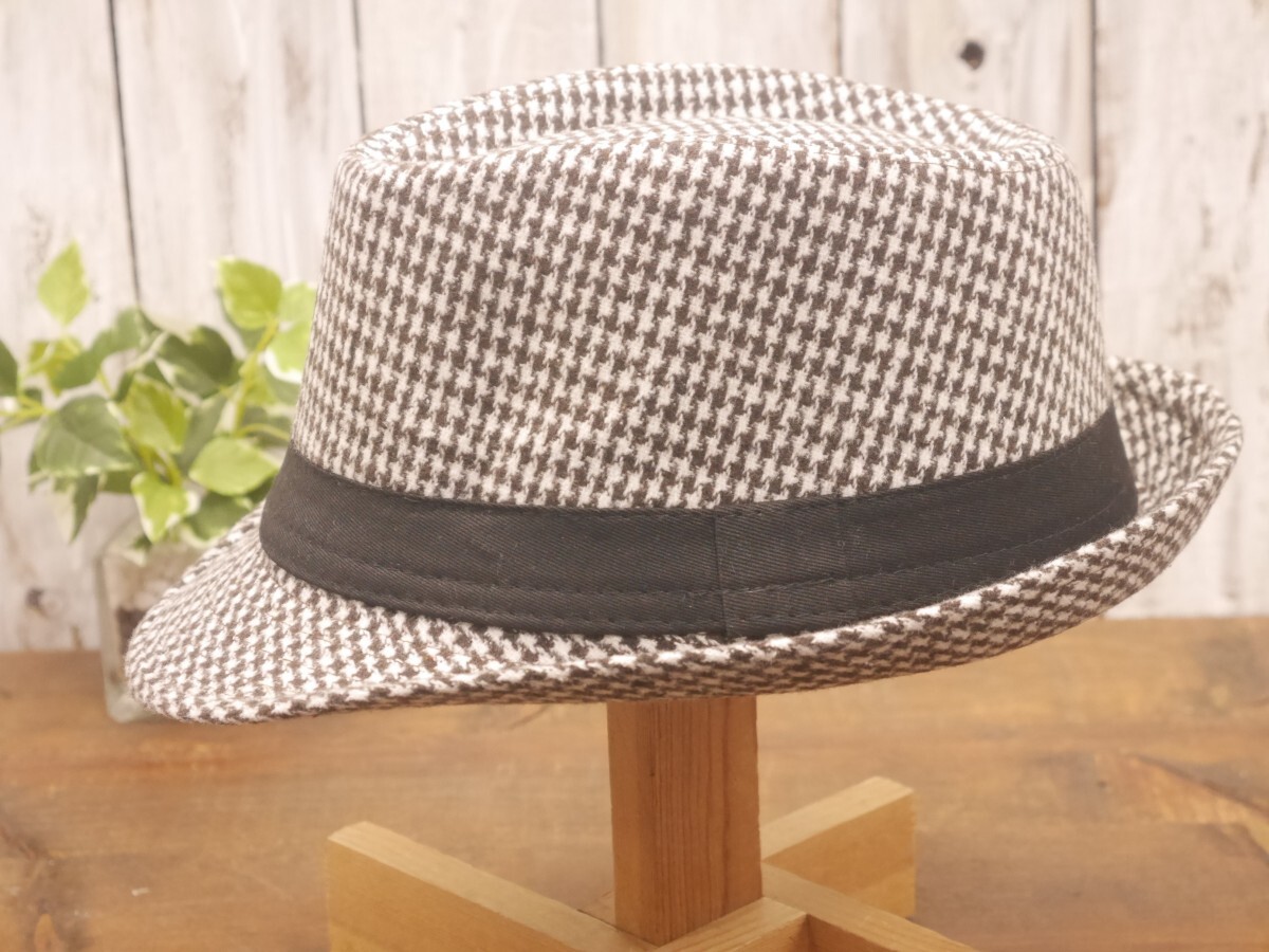 フェドラハットシンプル 千鳥チェック ブラウン ベージュ 秋冬 男女OK サイズ調整可 送料\450中折れ ボルサリーノ パナマ 中折れ